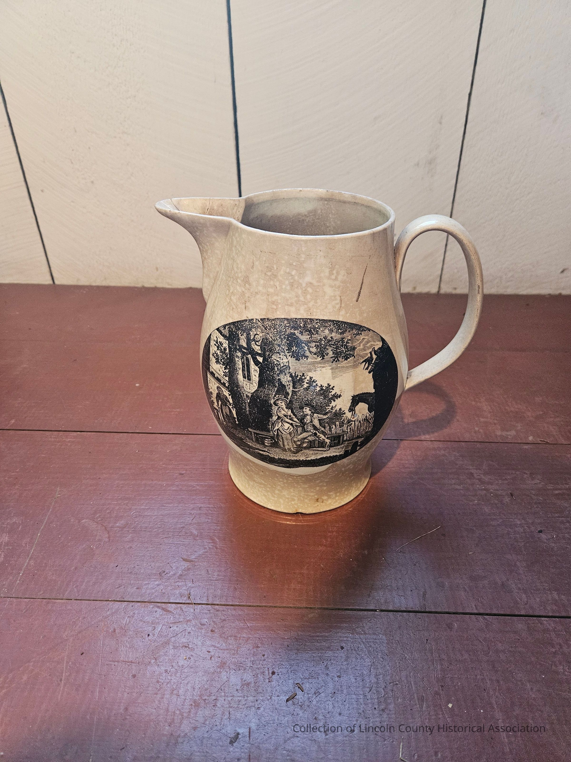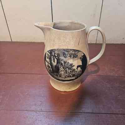 Large Liverpool pitcher. Cream with black designs. On one side, image of