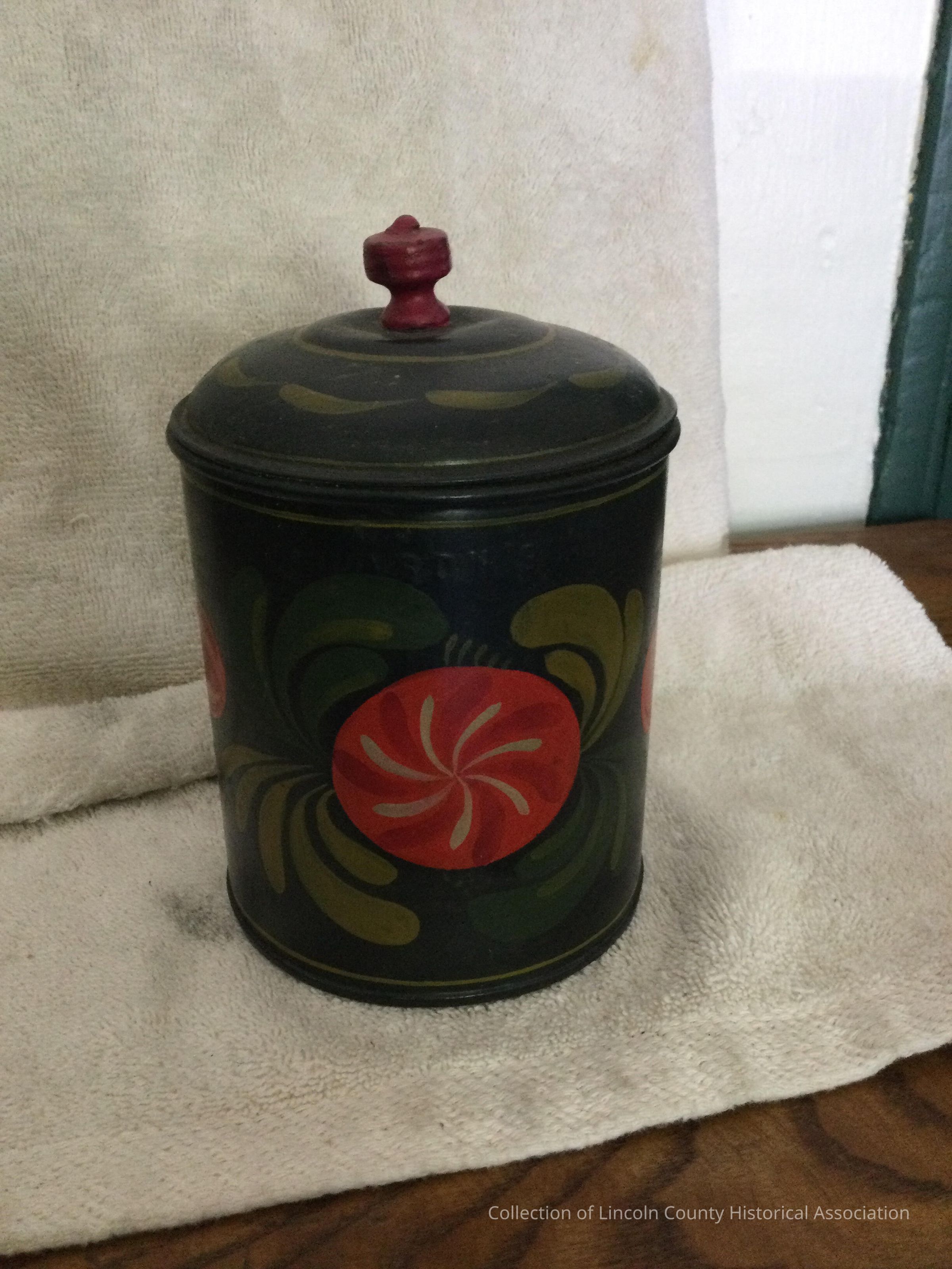 Tin canister with its lid. Exterior painted surface by Mrs. Donald Dike. This decoration is in the form of three tomatoes and leaves in two shades of green. Decoration is in Pennsylvania Dutch style, probably based on stencils. Red painted button on top of lid.Made/Created