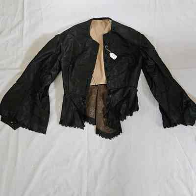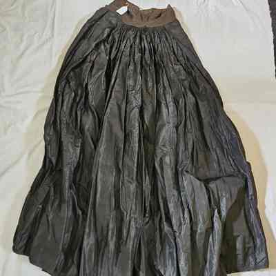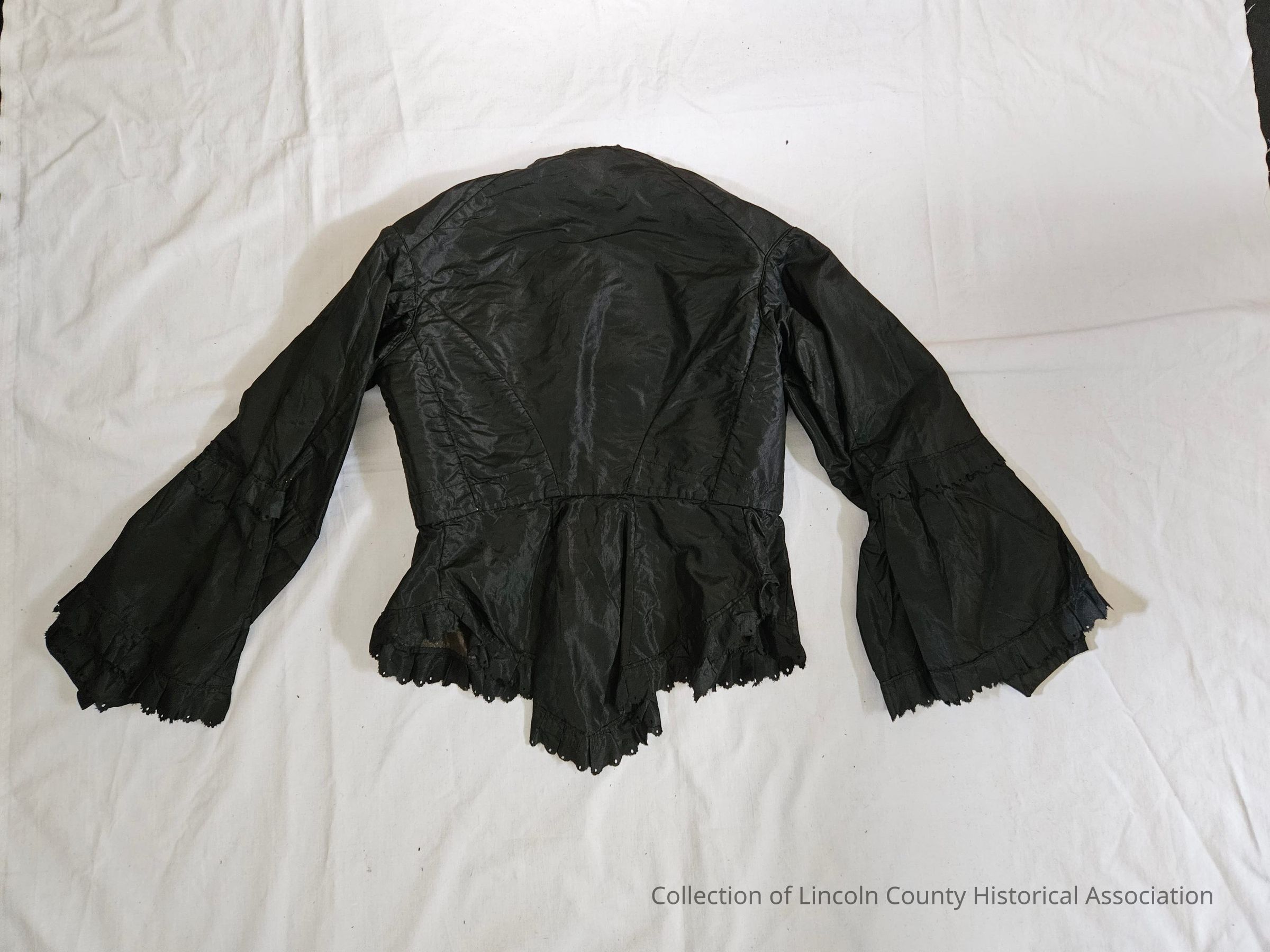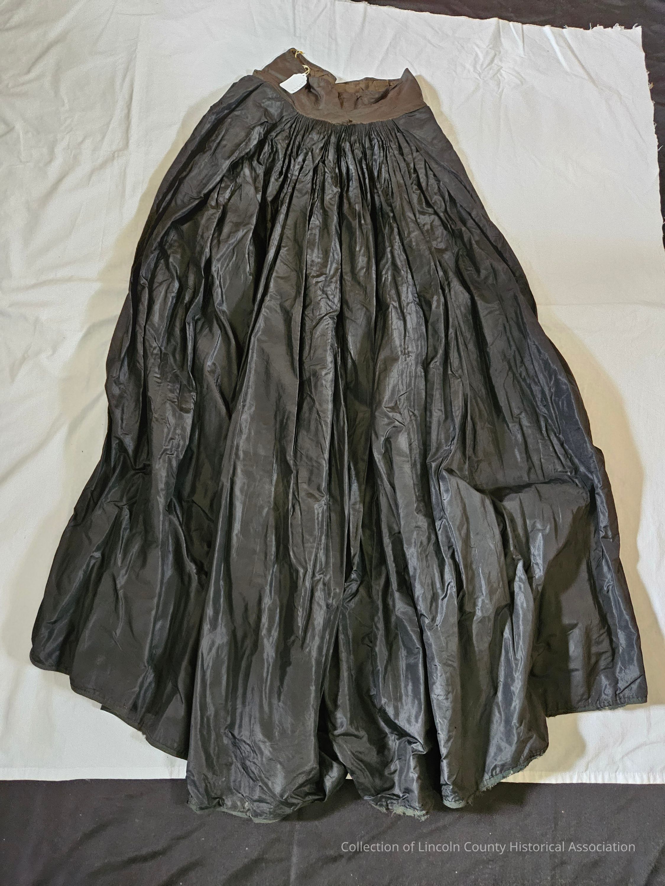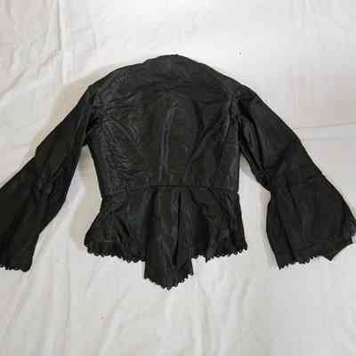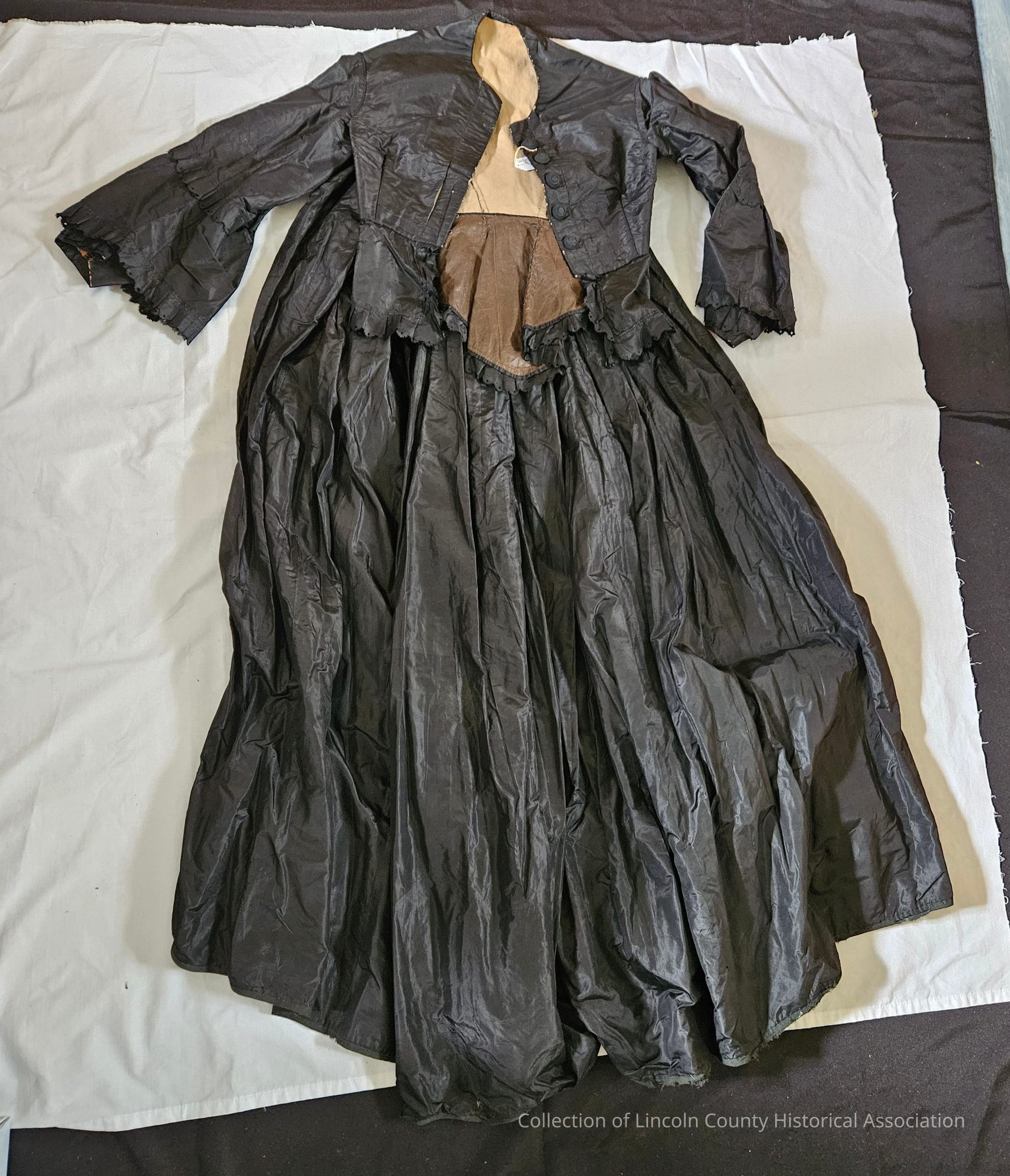 Matching black silk bodice and skirt. Trimmed in punched fabric. Front bottom of bodice is scalloped and the back bottom is in a fan shape. Fabric covered buttons on front of bodice. False pagoda sleeves. Skirt is gathered at waist.Clothing/Dress/Costume Details