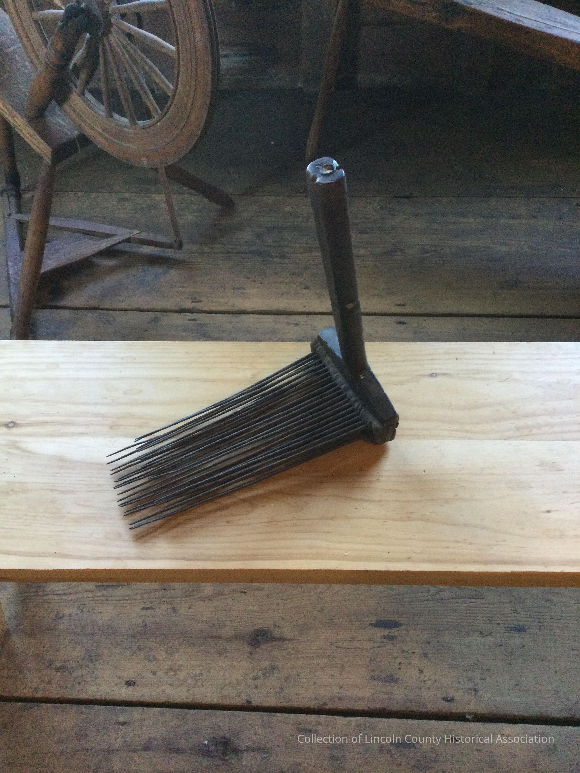 Hetchel. Wooden board shaped like a paddle with a long handle. Long spikes inset into two rows at right angle to the handle.Made/Created