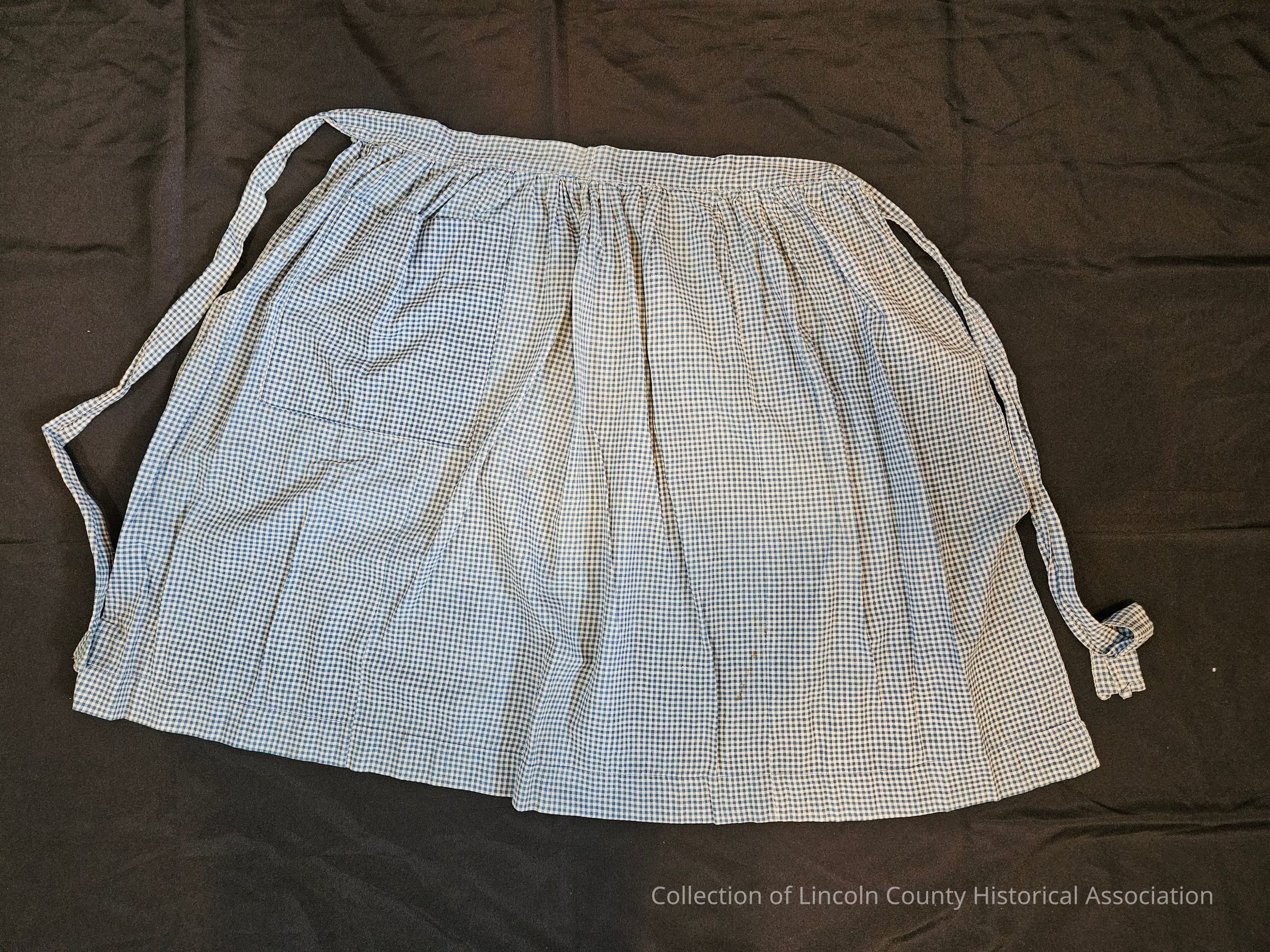 Plain blue checkered gingham/cotton apron. Two plain ties. Pocket in front. Machine stitched.Clothing/Dress/Costume Details