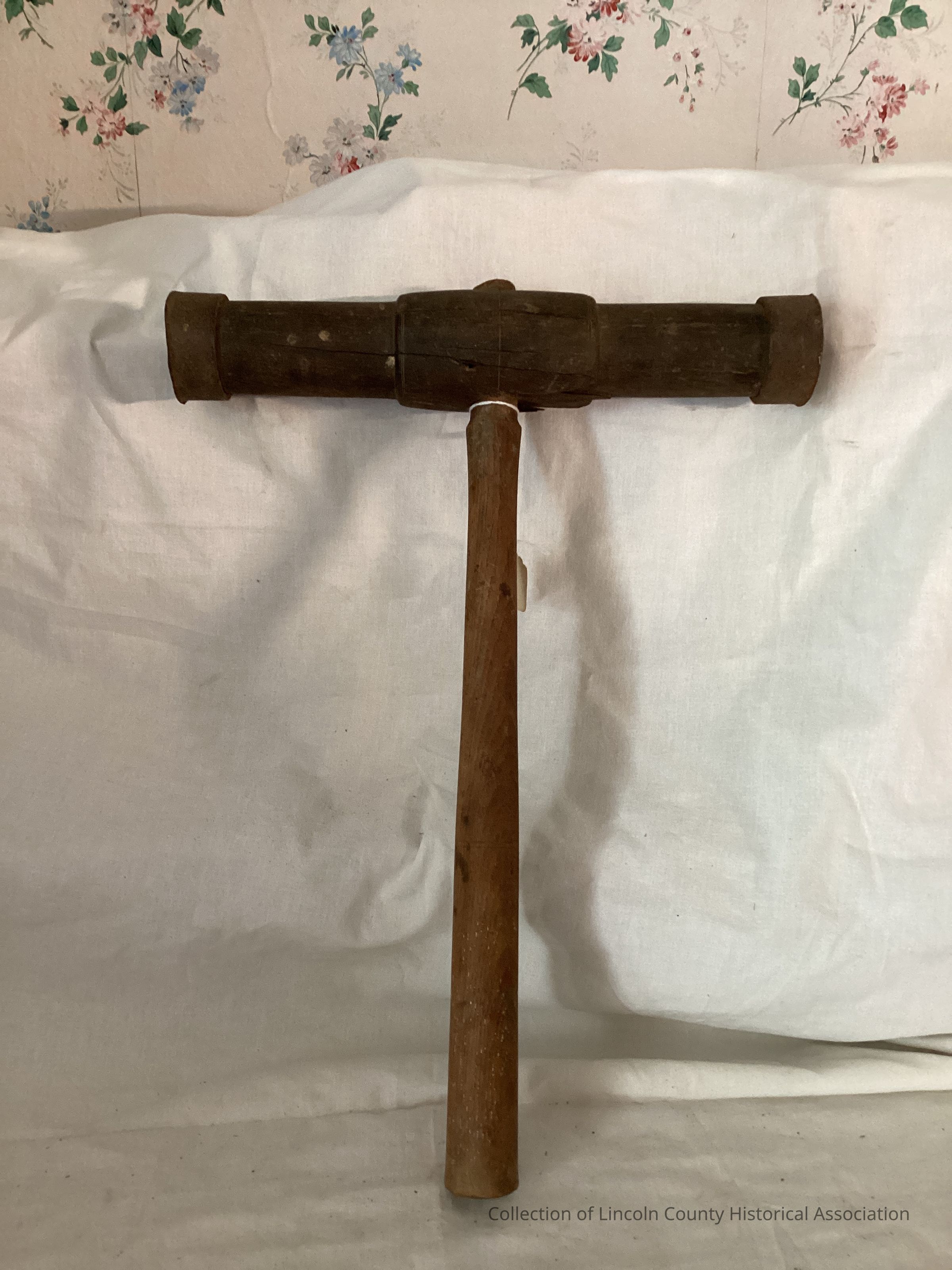 Wood and iron caulking hammer/mallet. Long handled and with the ends of the head braced with two iron rings. Handle is hickory.Made/Created