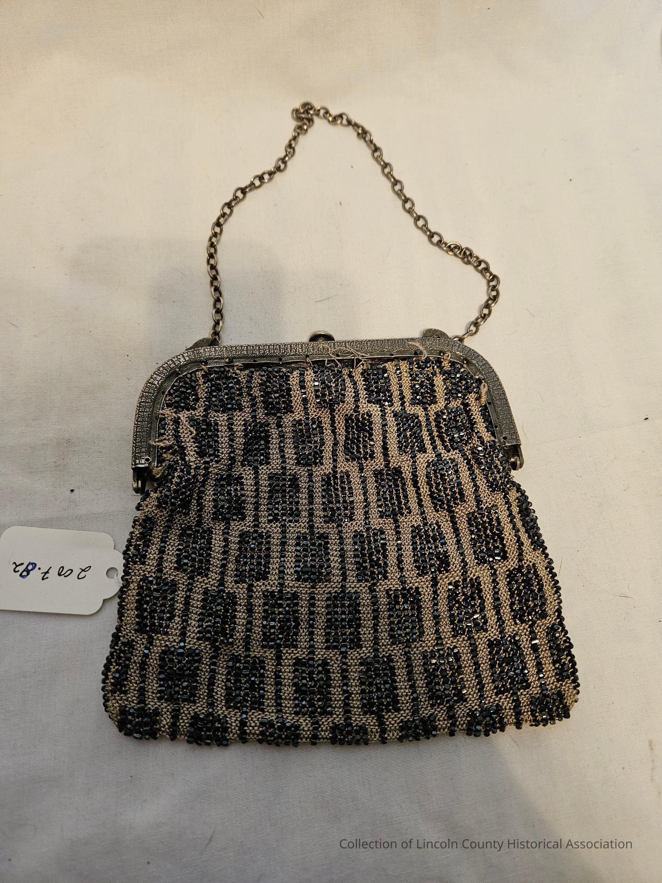 Woven tan mesh purse with blue beaded rectangle and line designs on both sides. Silver clasp with raised floral design and push button for opening. Silver circle charm hanging from clasp. Silver chain. Gray silk lining.Made/Created