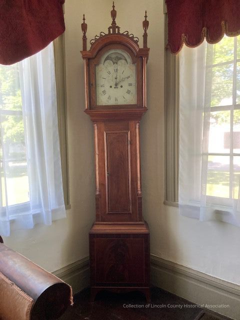 Tall case clock (familiarly known as a "Grandfather Clock"). Is in a fairly high country Federal style and is made of various woods including walnut and cherry. Has French feet. The three crowning urns may well be of later date.