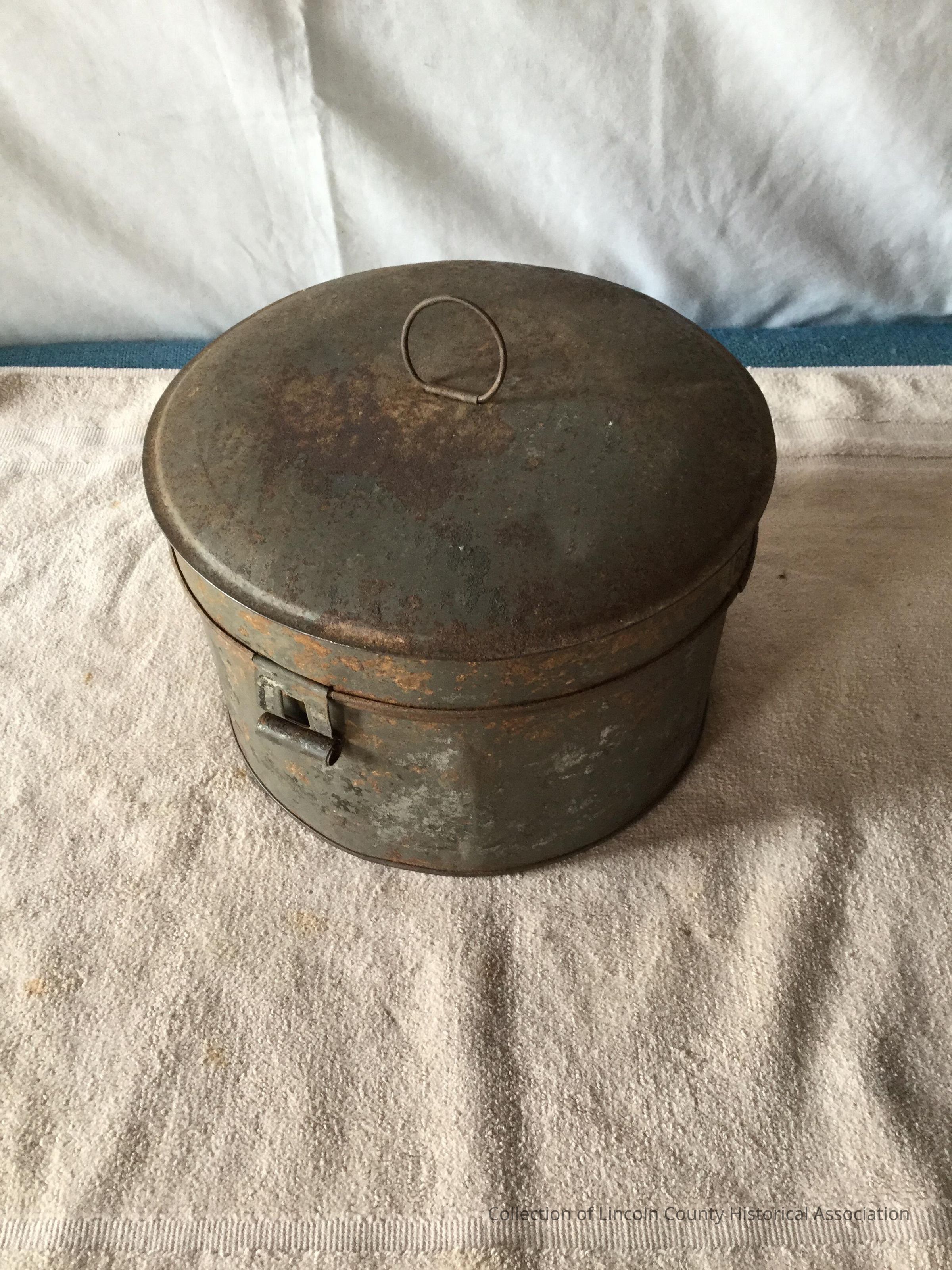 The tin is worn and the surface somewhat corroded. The 3 x 5 inventory card states that the paint has worn off. However, it is not clear that the object was ever painted. Even by 1989 it was described as with the exterior in poor condition with the tin completely flaked off and with much rust. By contrast the interior retained much of the tin and has minimal rust.
