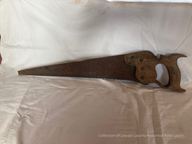 Unfinished wooden handle with metal blade. Metal fasteners attached handle to table. Decorative indentations in bottom of handle