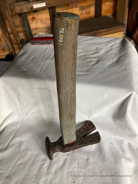Shoe Maker's Steel Hammer with a wooden handle probably made of hickory. Steel facing on wrought iron shank. Entire handle painted gray. Hand forged iron body.