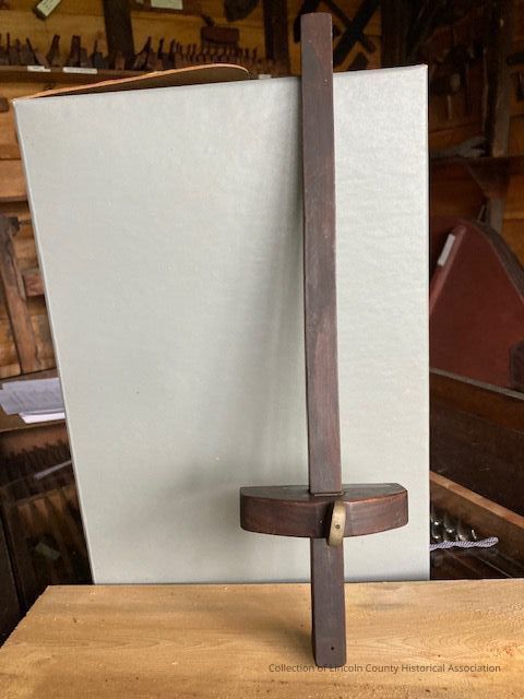Marking gauge made of rosewood, brass and steel. Steel pin (for scratching) set into a wooden block which, in turn, is set into and runs along a shaft in the wooden block. With a brass thumb screw through a rabbited half moon overbarMade/Created