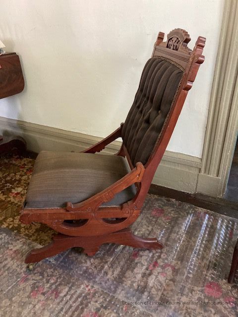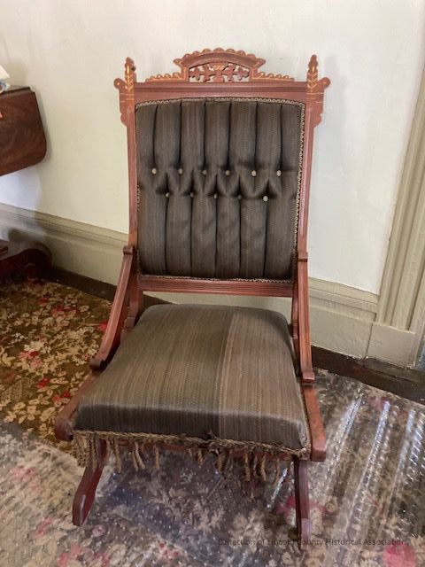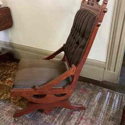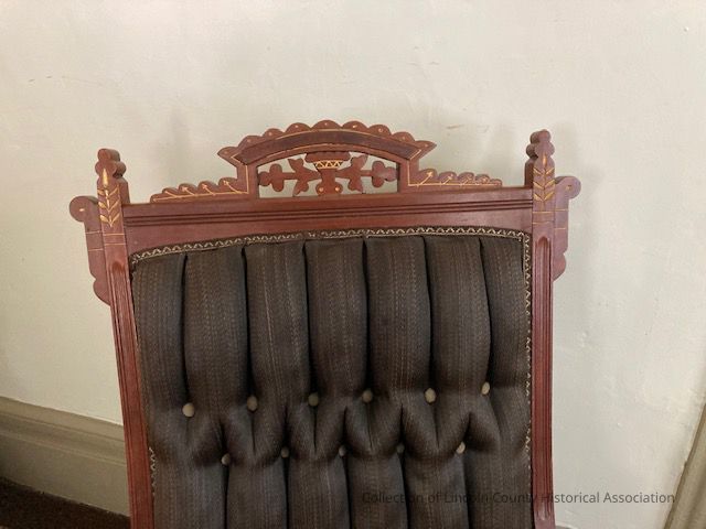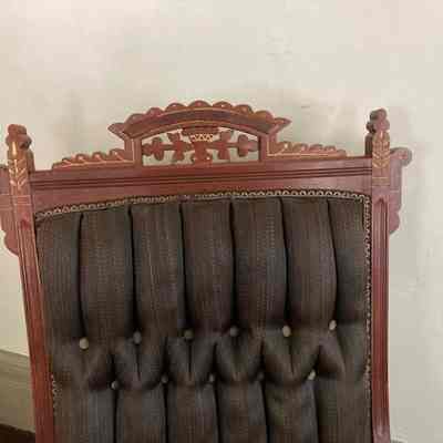 Mahogany eastlake style side chair with seat upholstered in black horse hair. Gold colored highlights set into carved indented patterning most evident across crest rail.