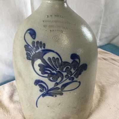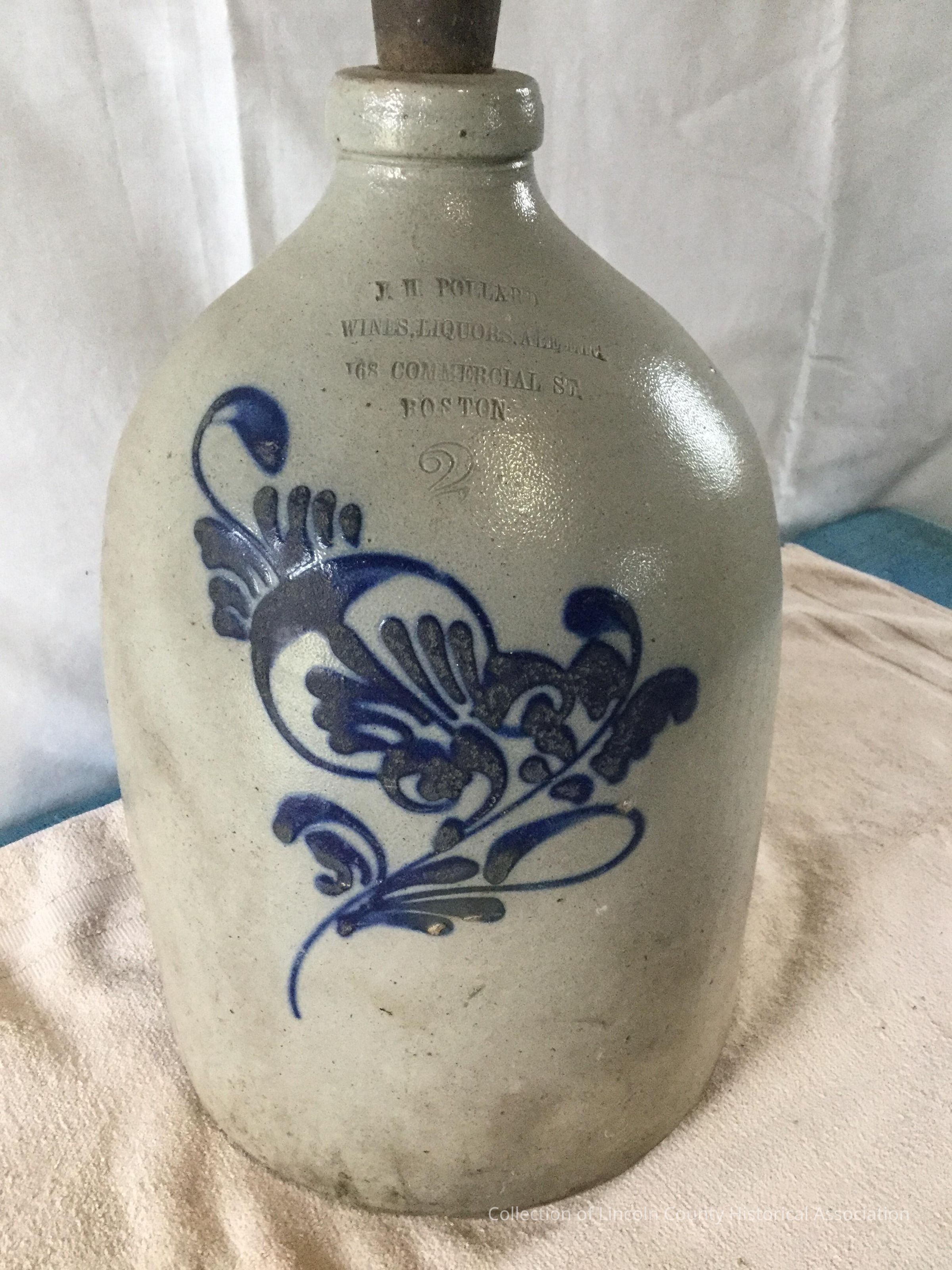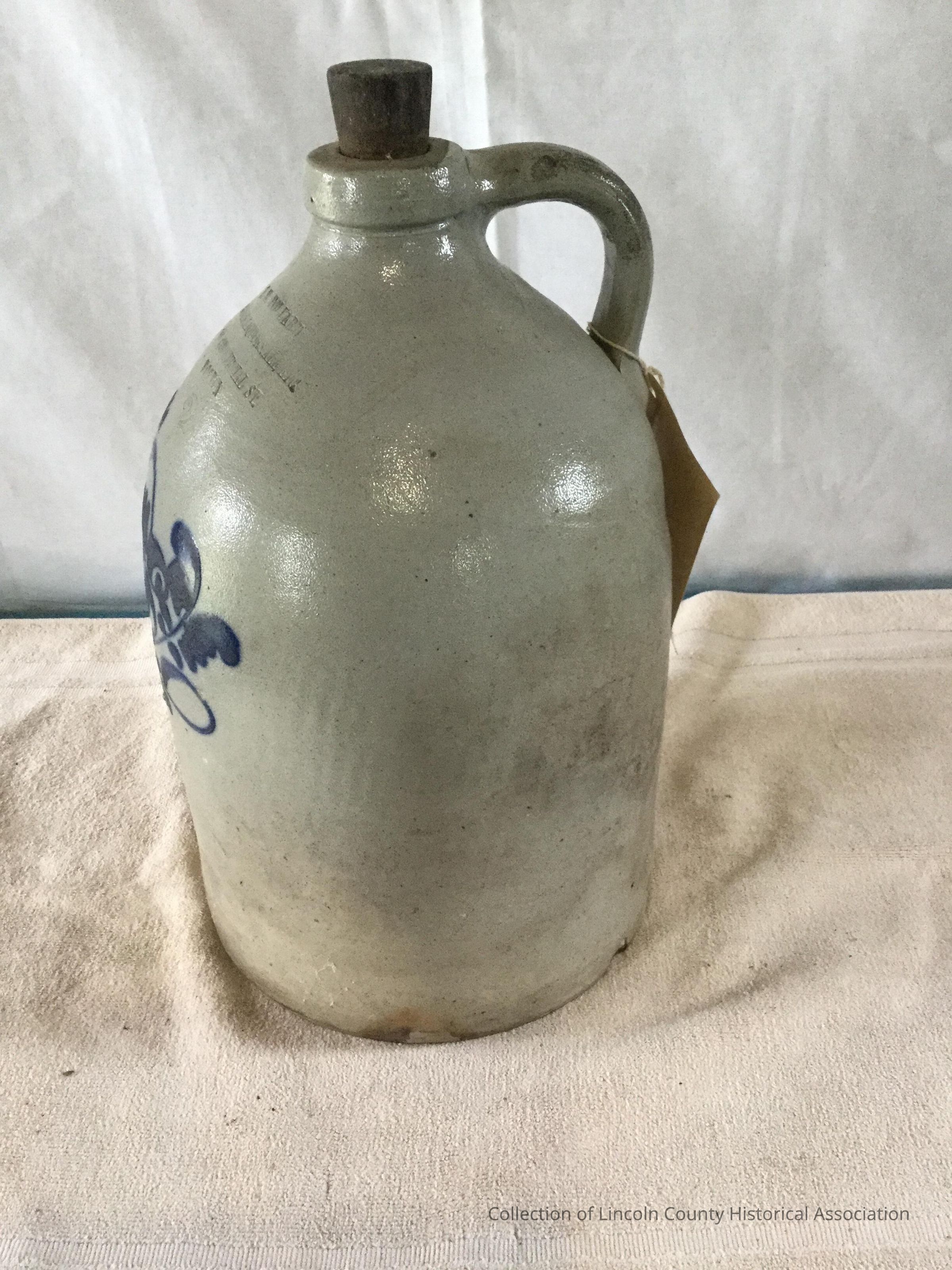 Two gallon stoneware jug with a single loop handle and with cobalt blue vine decoration and letteringMade/Created