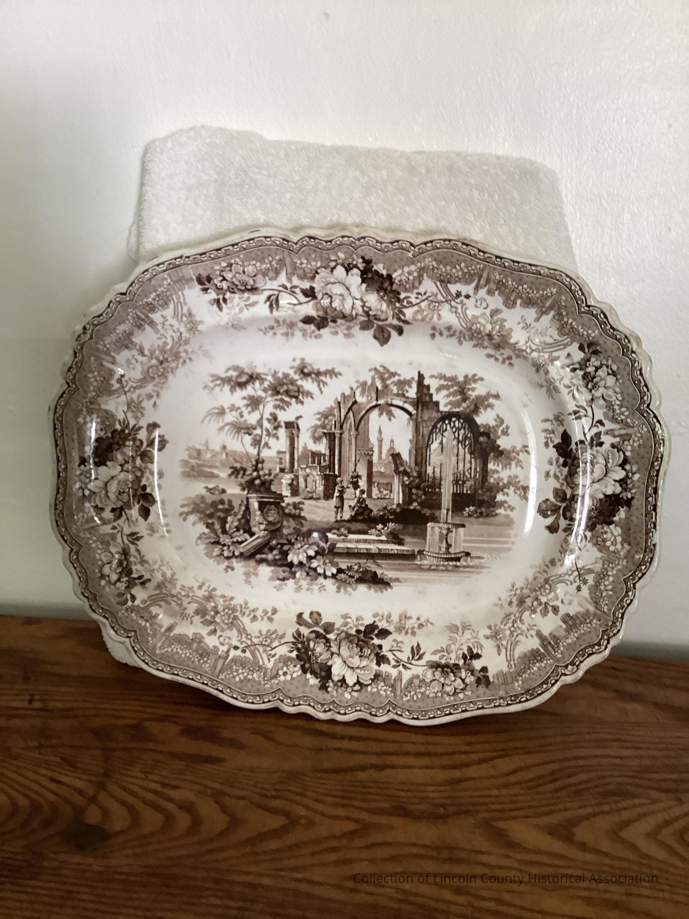 Brown transfer ware platter with a Gothic architectural fantasy at center, vegetal outer border and with a white partially scalloped rim.