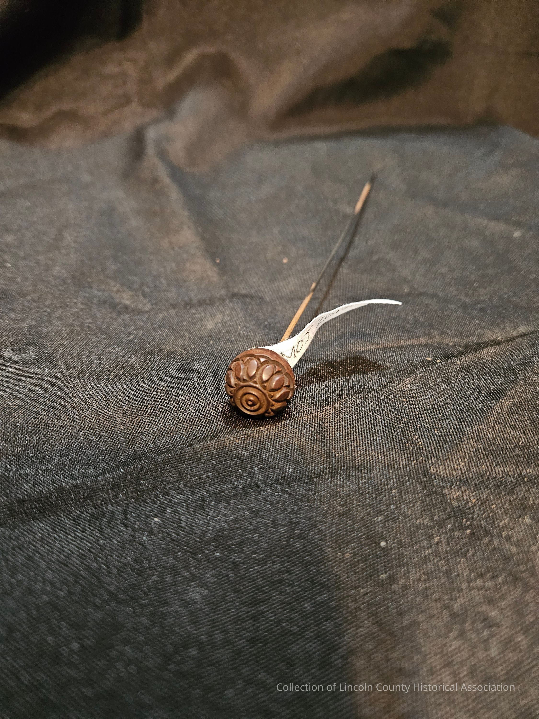 Women's hat pin. Wooden carved ball head. Carved floral design on top of ball.