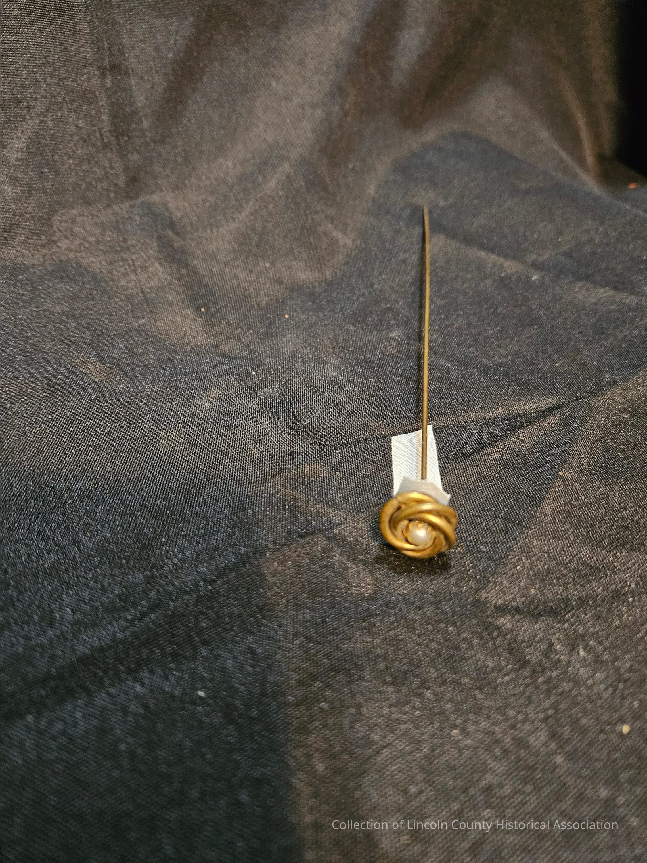 Women's hat pin. Swirl brass floral design on head with pearl in center. Flat top. Gold in color.
