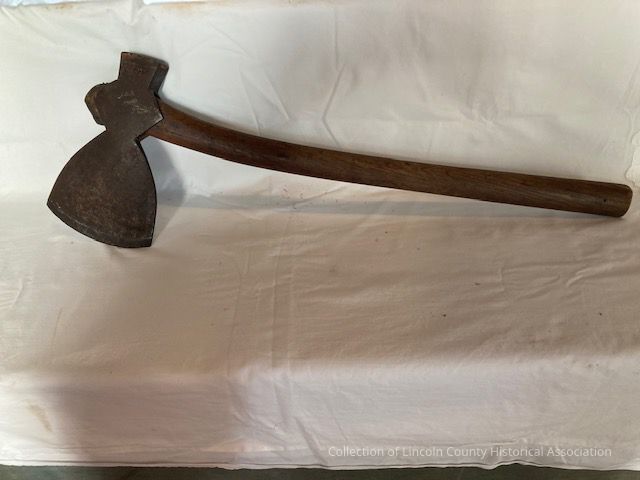 Axe with wooden handle deliberately canted. Slightly curving steel tipped iron blade