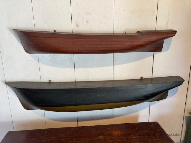 Wooden half model of a ship's hull (the J. F. Merry). Painted black and gold and mounted on a backing board.Made/Created