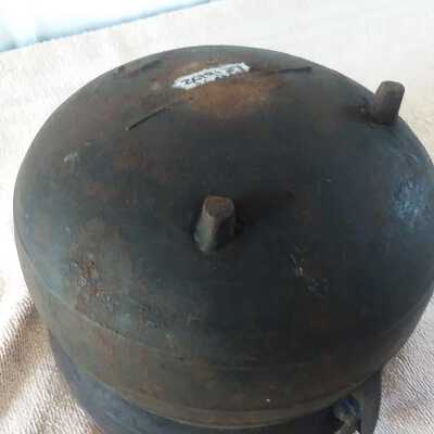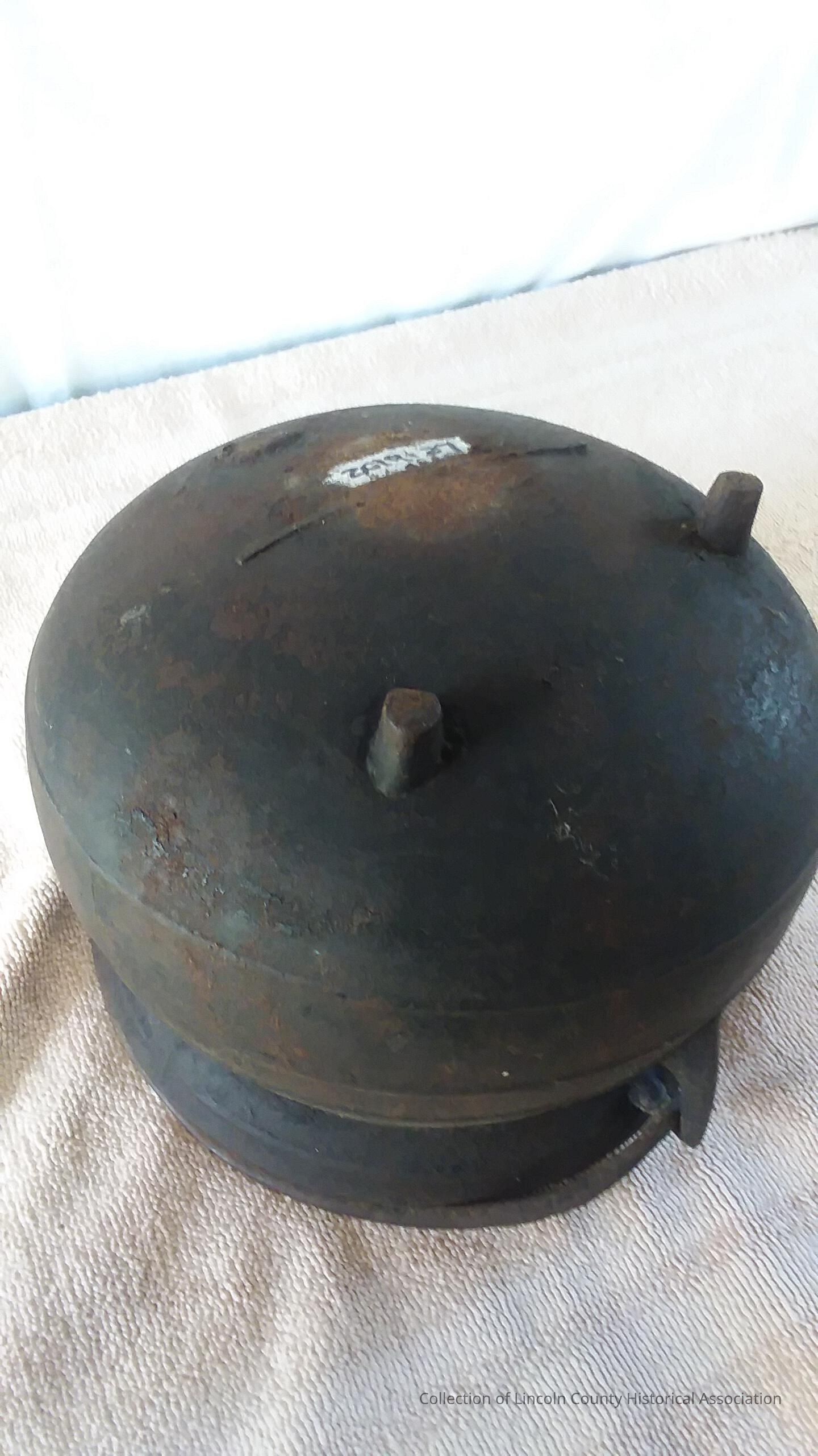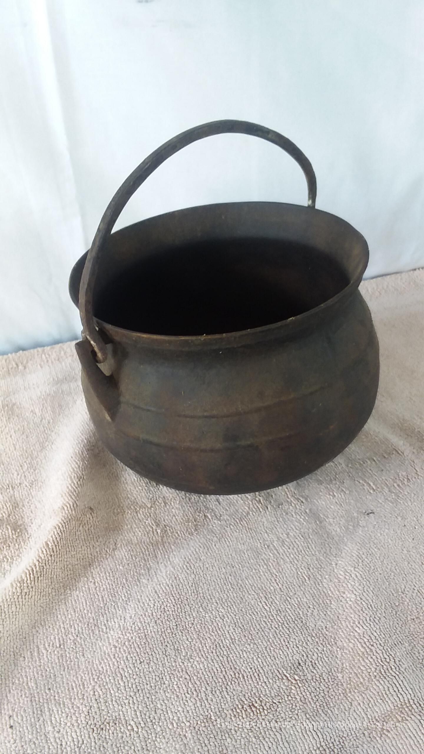Small cast iron pot with attached handle and on three short legsMade/Created