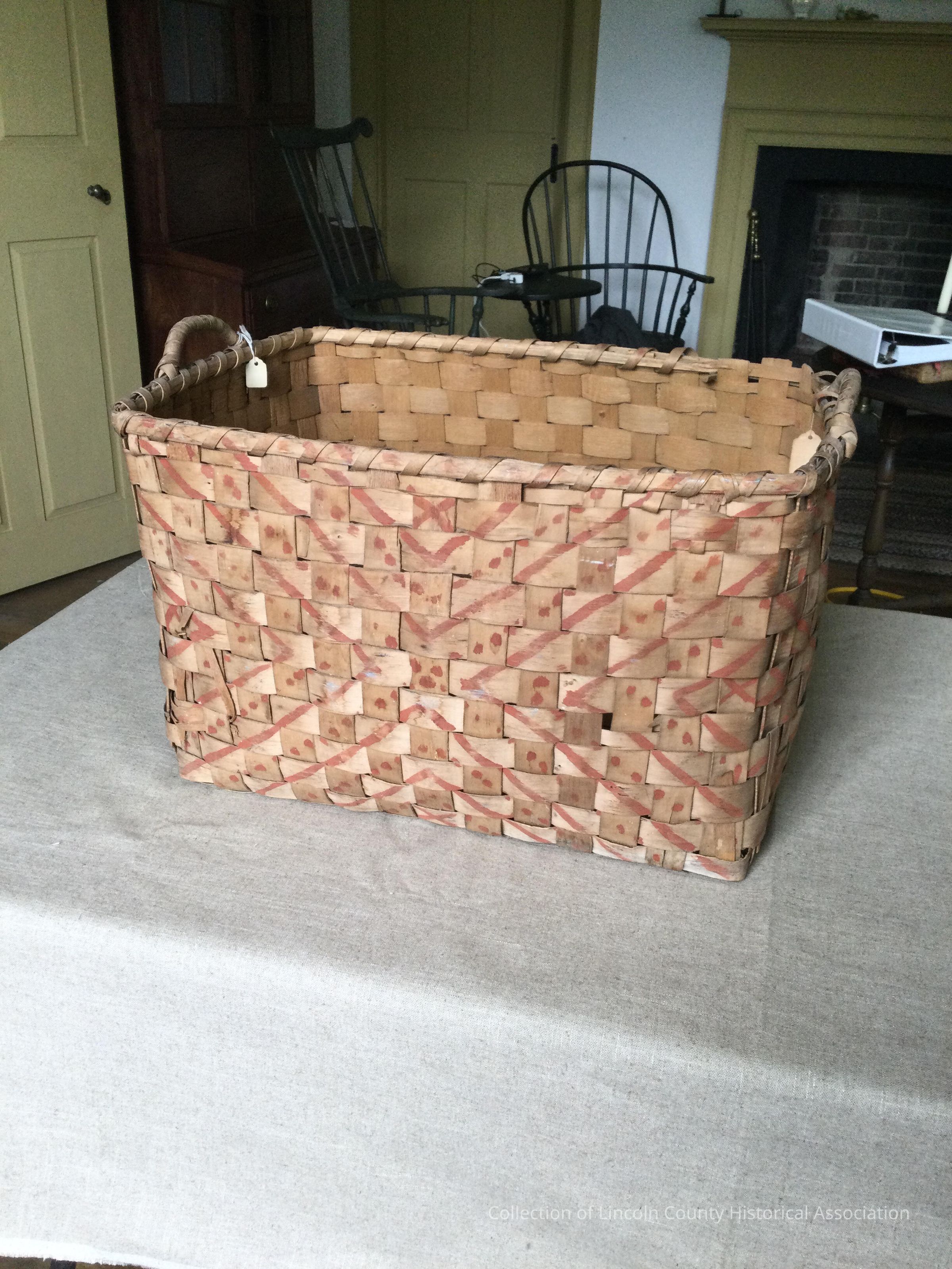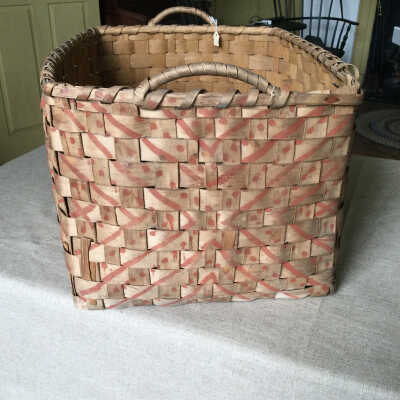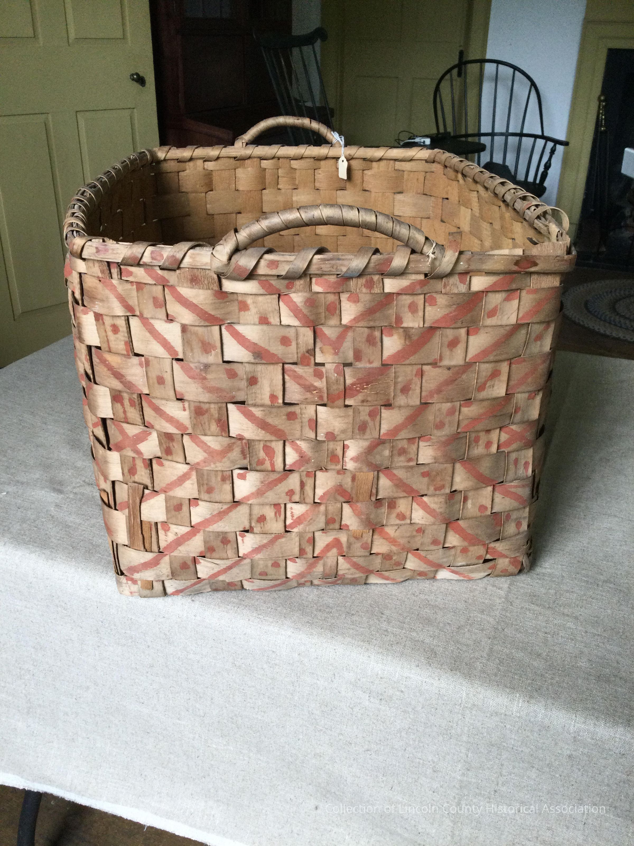 Two handled oblong splint field basket made of ash. Indian red paint forming "X" and dotsMade/Created