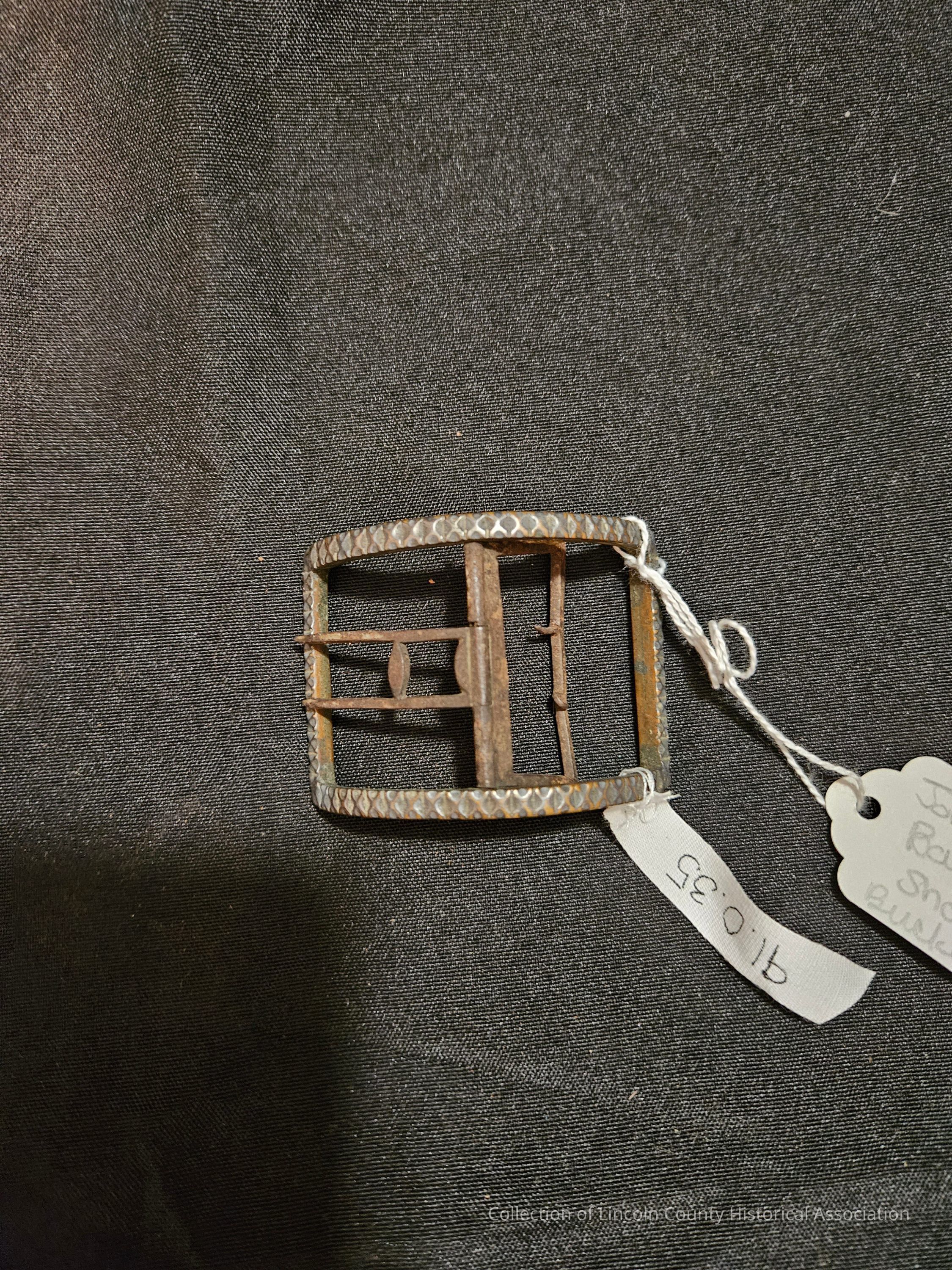 Jonathan Bowman's shoe buckle. Simple metal buckle with "X" motifs all over.Made/Created