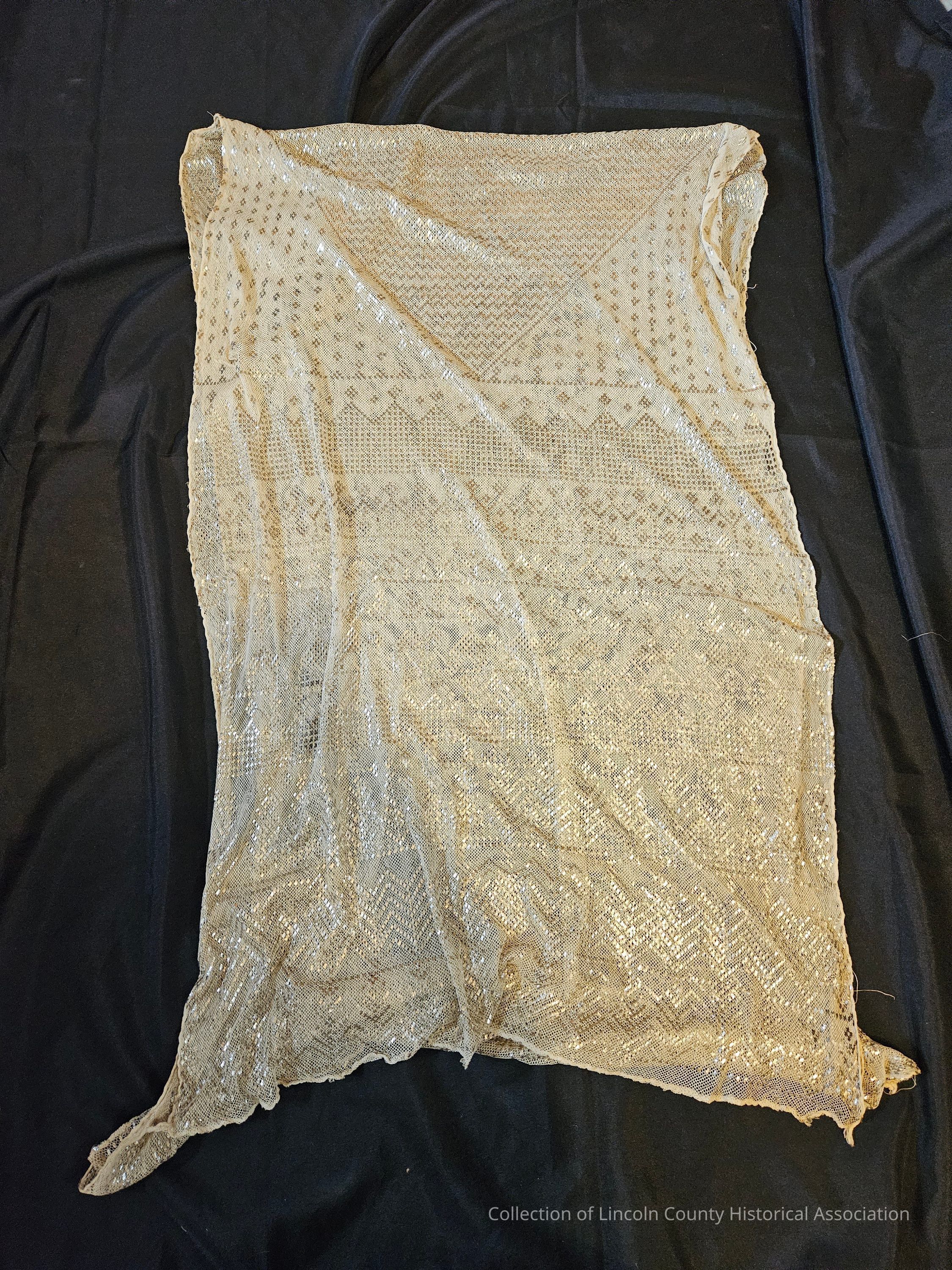 Long cream colored rectangular cotton mesh shawl with heavy silver beading in geometric patterns. Scalloped edges.