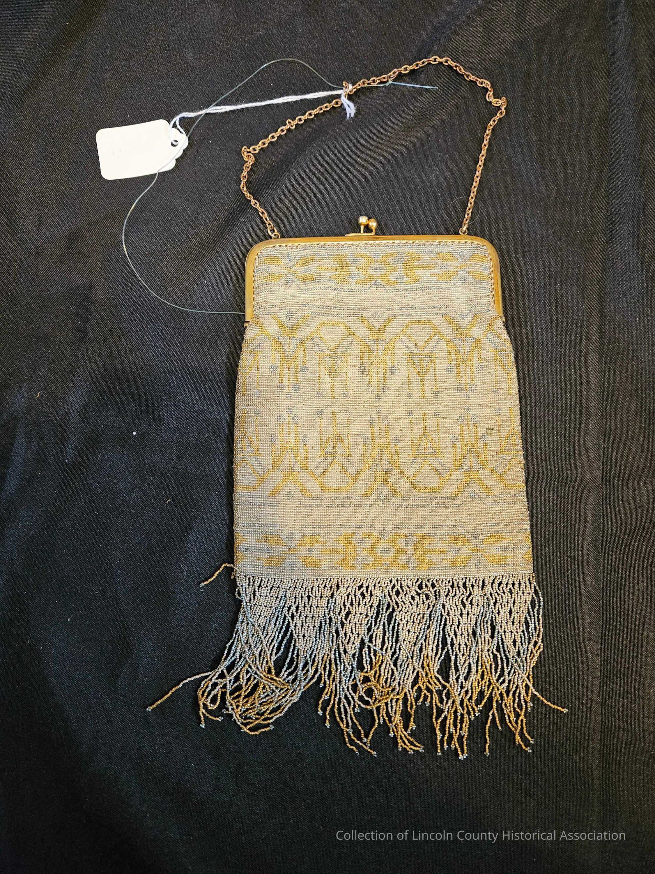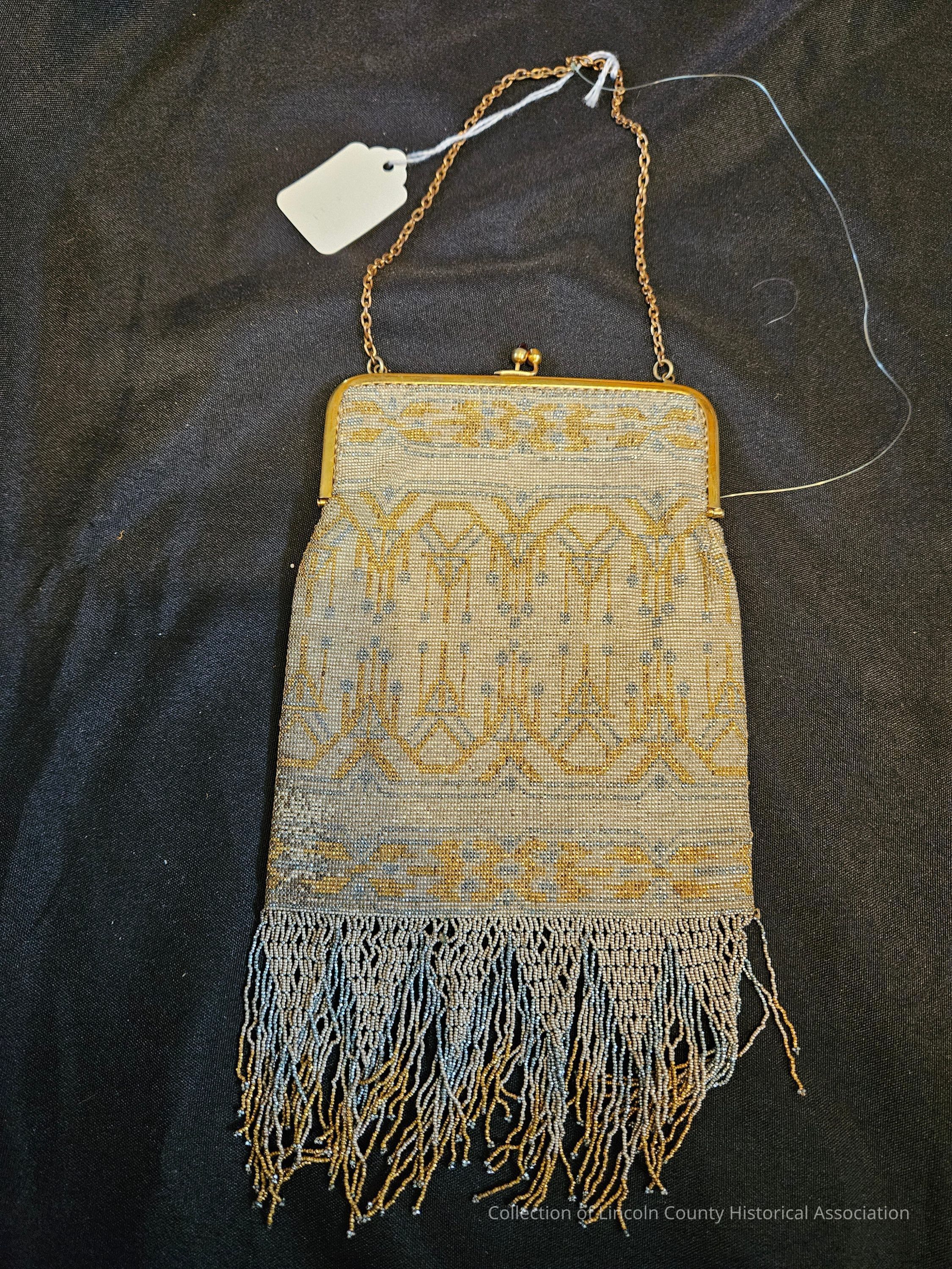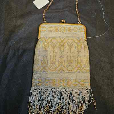Silver, gold, and blue beaded purse with geometric designs. Gold clasp with red jewels. Gold chain carrying strap. Silver, gold, and blue fringe. Pink satin lining with one interior pocket.Made/Created
