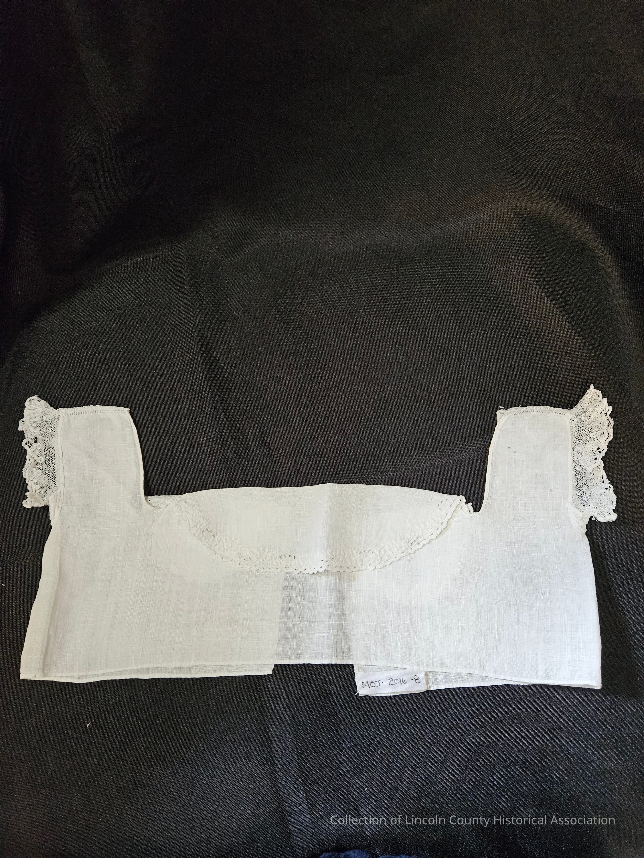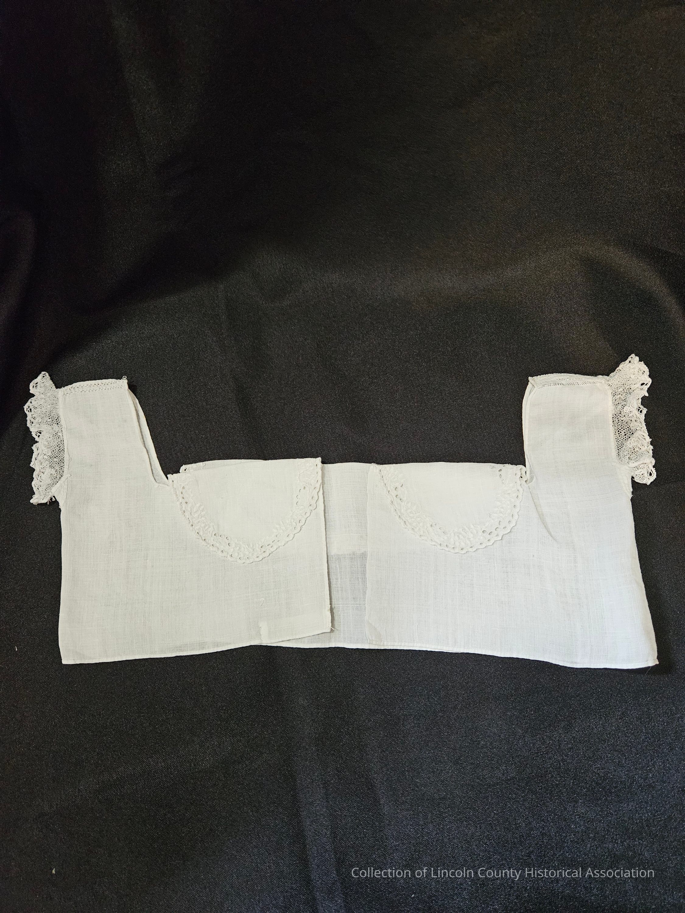 White cotton infant shirt. Ruffled lace edges around arms. One half circle flap with scalloped edging on the front and two on the back. Back of shirt is not sewn together.Clothing/Dress/Costume Details