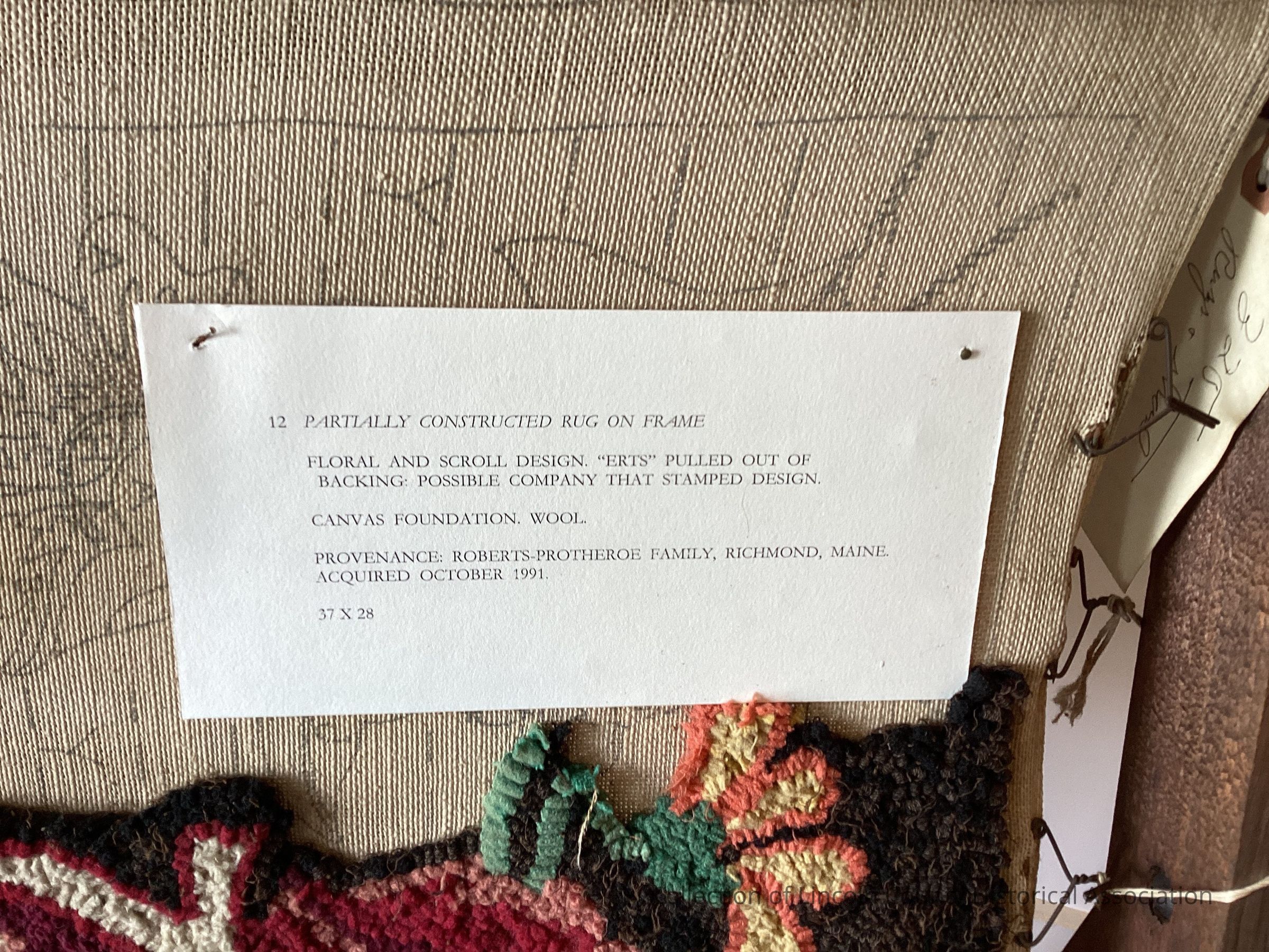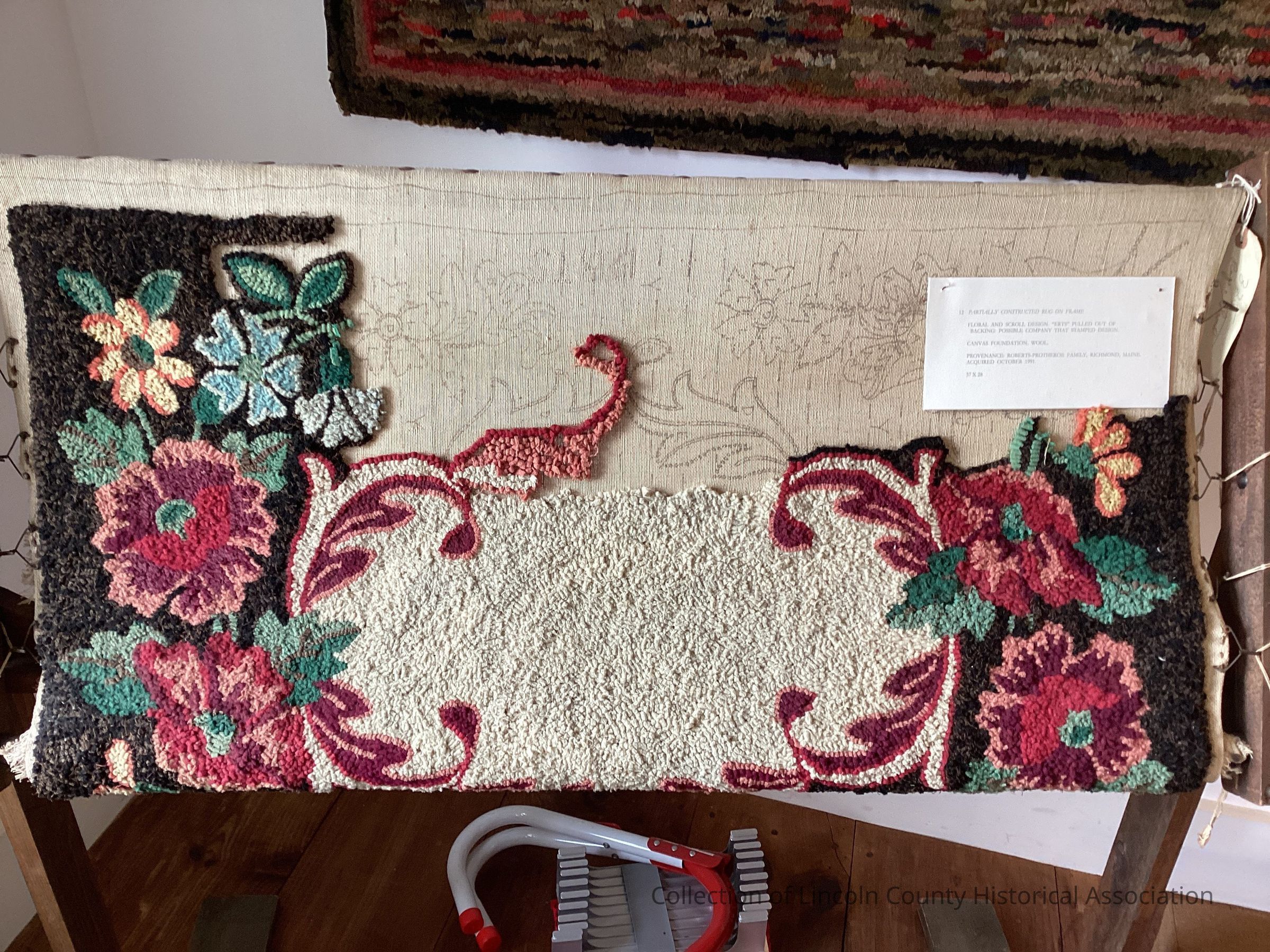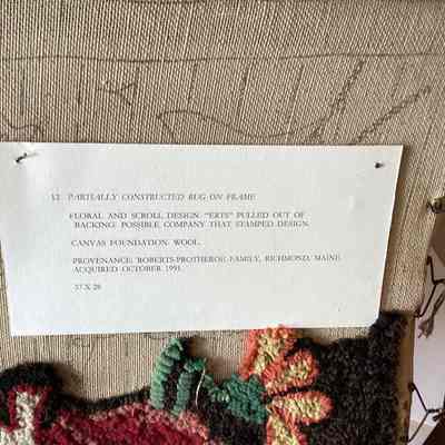 Unfinished hooked rug on frame. Floral and scroll design. Possibly company that stamped design. Brown and white with red, blue, and orange flowers. Canvas back and wool yarn.Made/Created