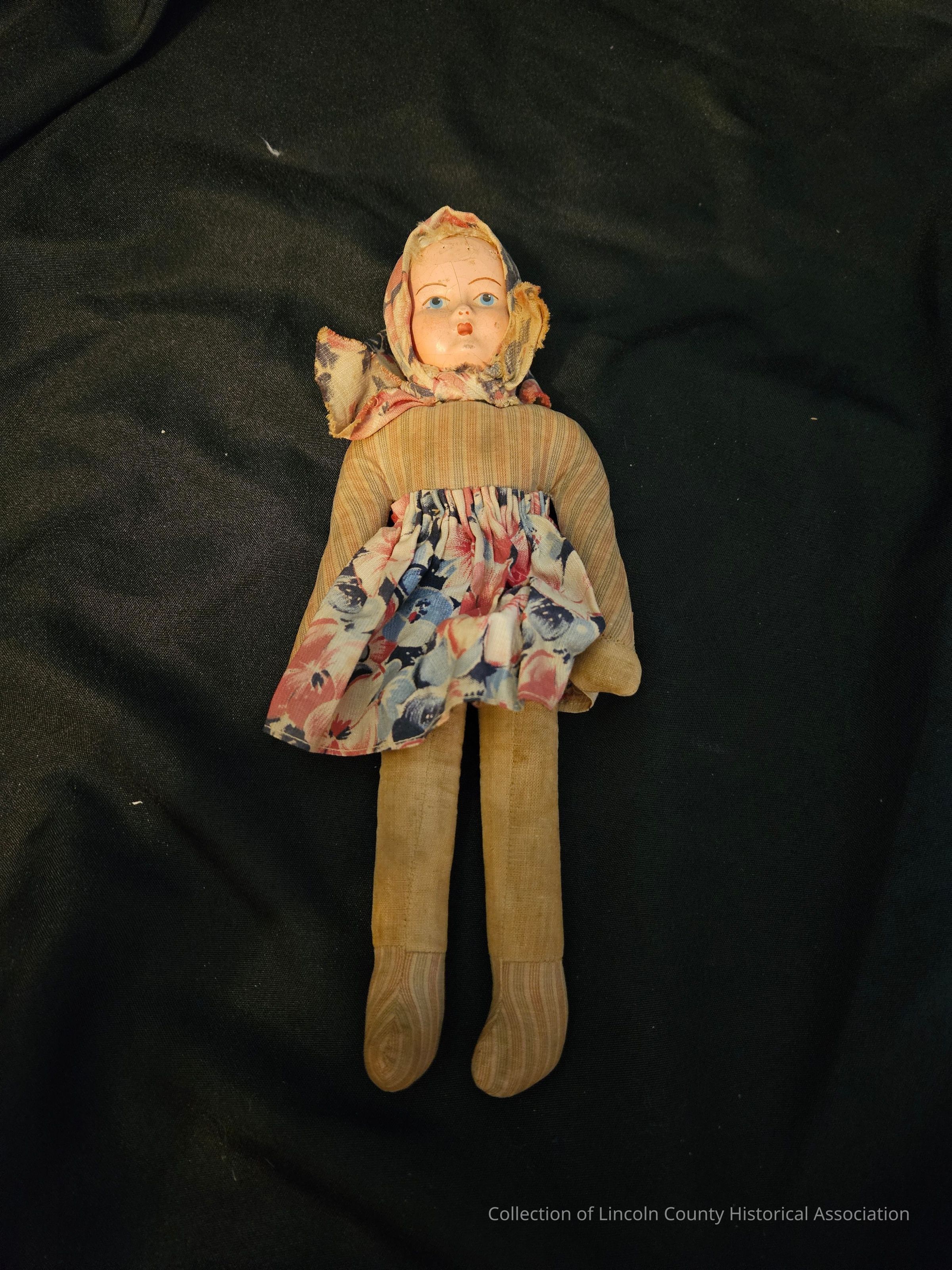 Female doll made of porcelain. Pink and blue floral fabric skirt and head scarf. Body and legs covered in stripped fabric.