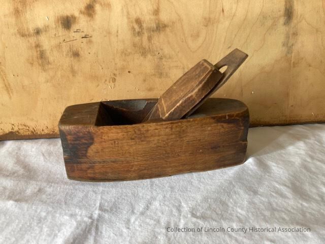 Smoothing plane with iron blade set into a wooden block. Is boat shaped and tapers at endsMade/Created