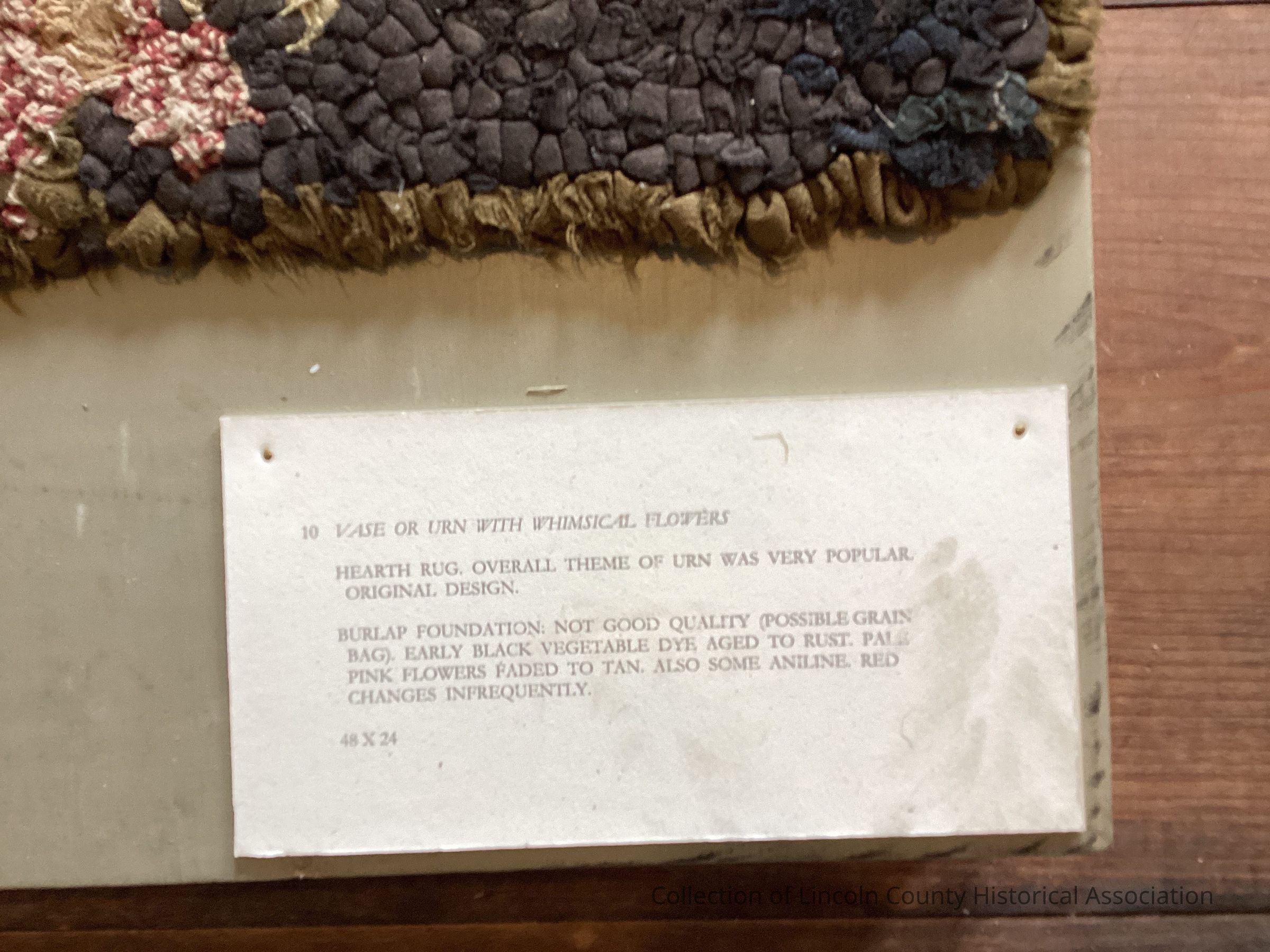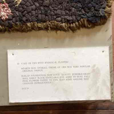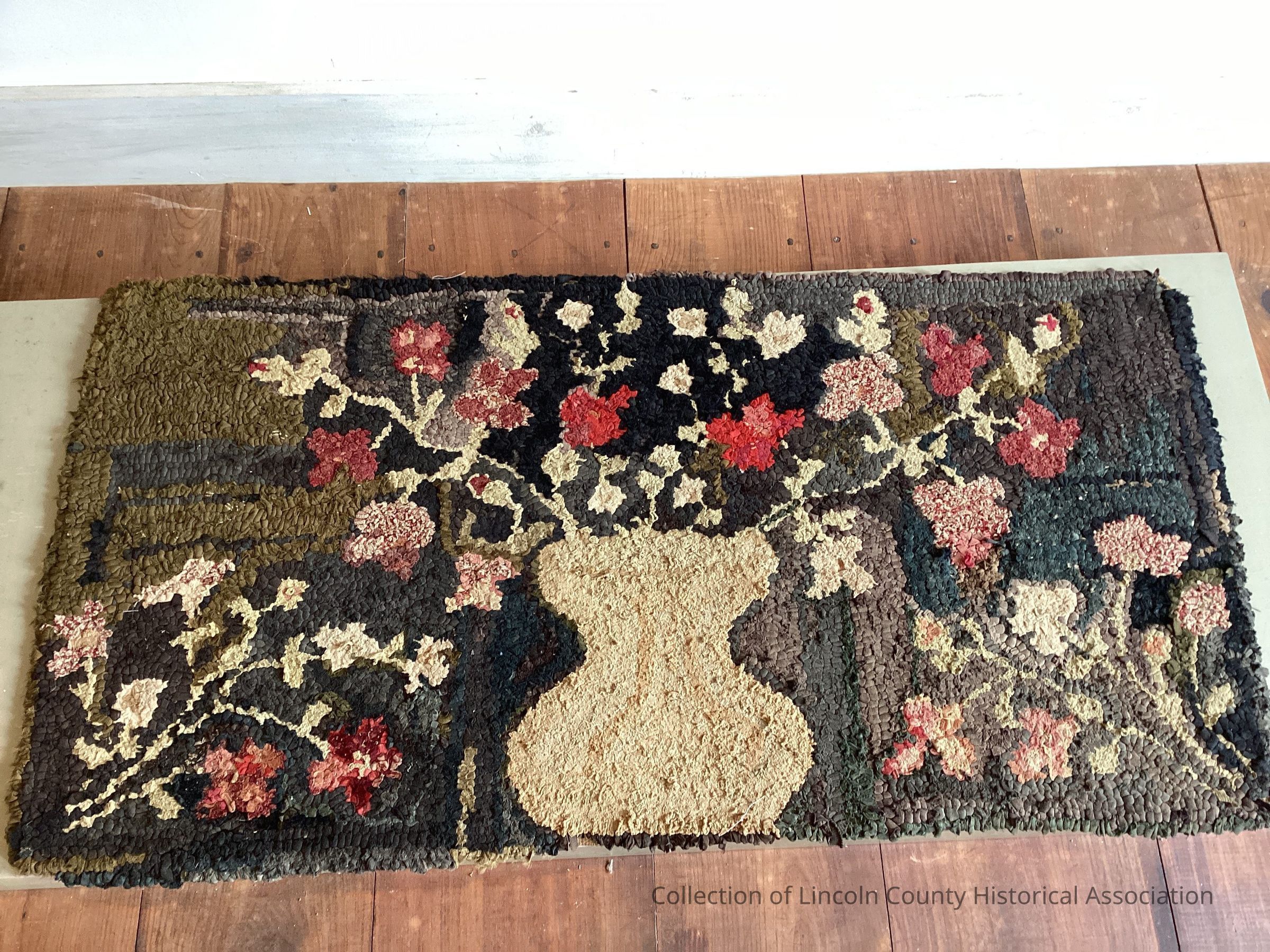 Rectangular hearth hooked rug. Image of tan urn with red and pink flowers. Tan/white branches. On a dark black background. Early black vegetable dye. Burlap foundation.