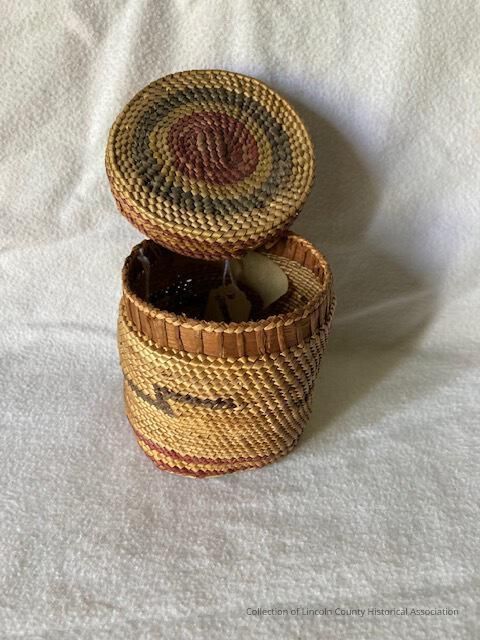 Small cylindrical splint and grass basket with lid. Decorated with red, yellow, and purple decoration. From the Northwest coast of North America, possibly Makah.Made/Created