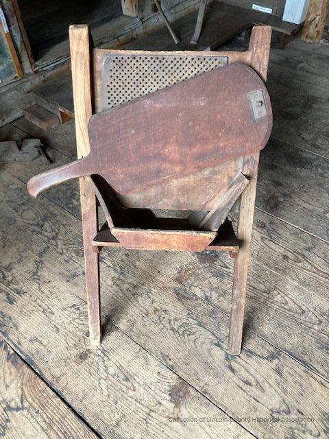 Corn huller. A framed wooden container on legs which is fitted with a knotted iron plate on one side and a movable iron plate set onto a wooden plate against it. Has a funnel below to catch and direct corn kernels into a receptacle. With a wooden crank handle.