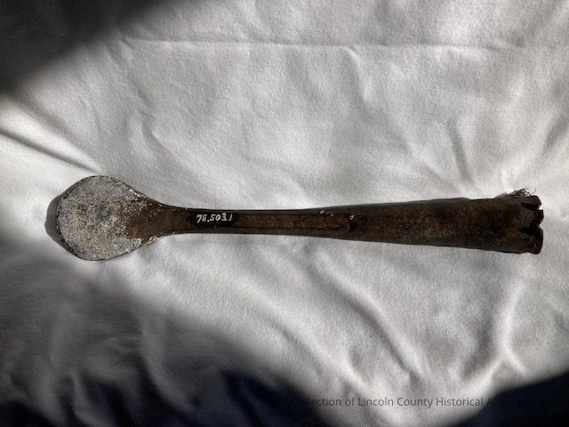 Wrought iron barking spud head shaped like a spoon. It would have been mounted on a wooden handle (now missing). The shank and blade are iron but the blade has a steel edge. The spatula blade (now with white deposits) was apparently used to stir liquid plaster or a similar substance.
