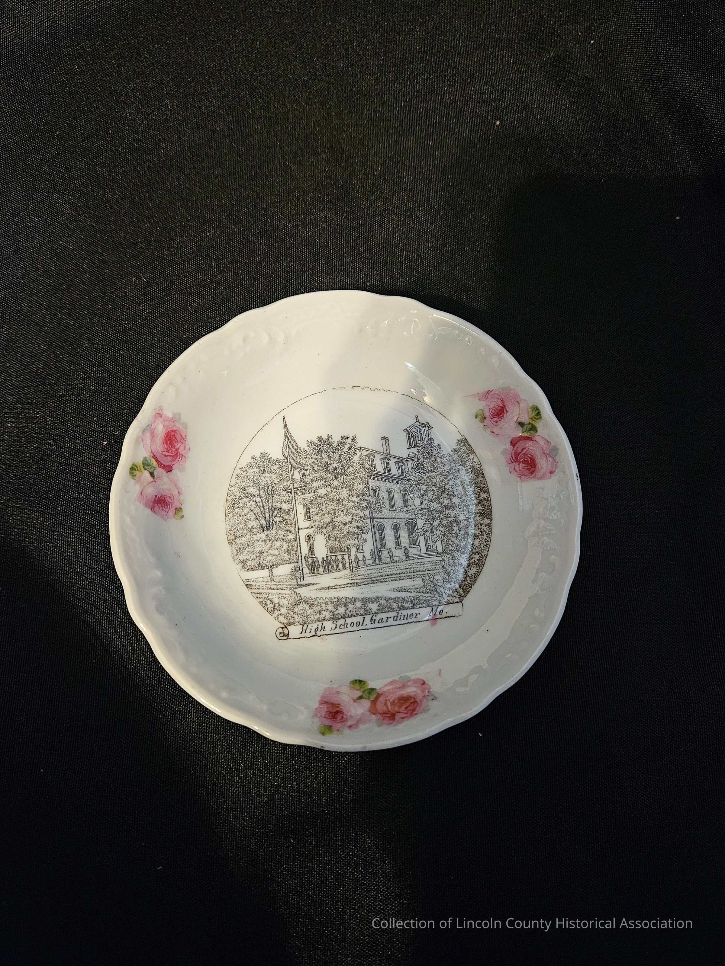 China souvenir dish. Black and white image of Gardiner High School in center. Three pairs of pink roses around edge.Made/Created