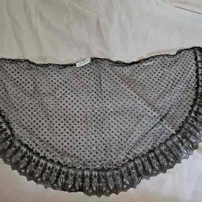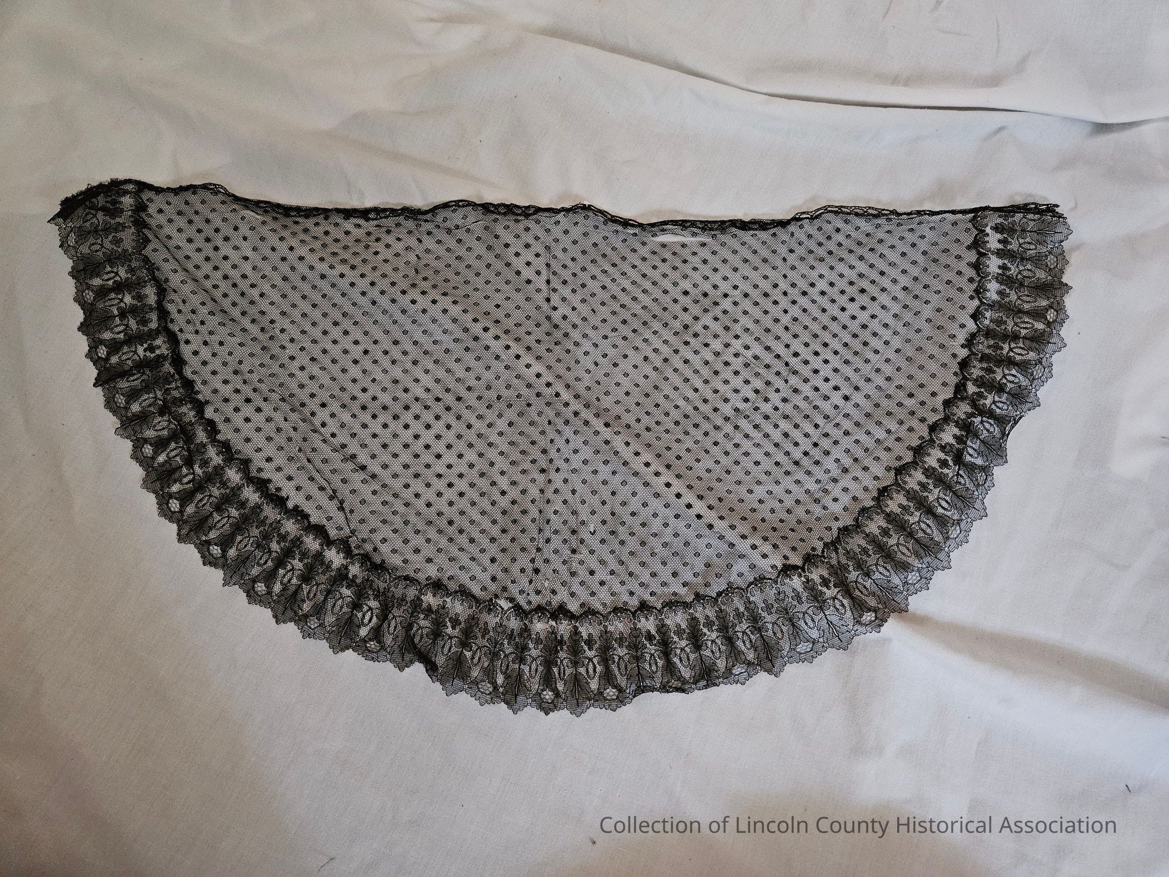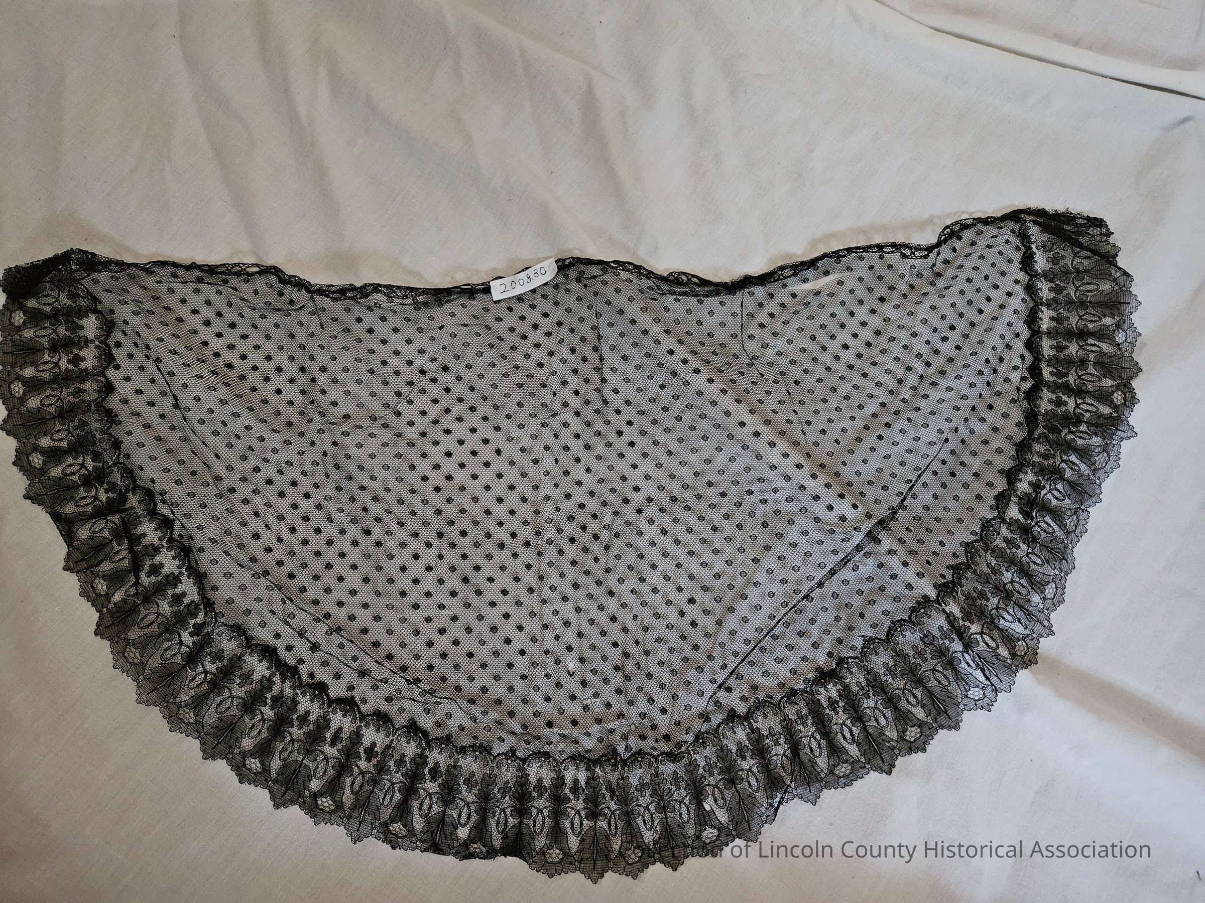 Large black net lace collar. Polka dotted design in the center and floral pattern around edges. Half moon/circle shaped.
