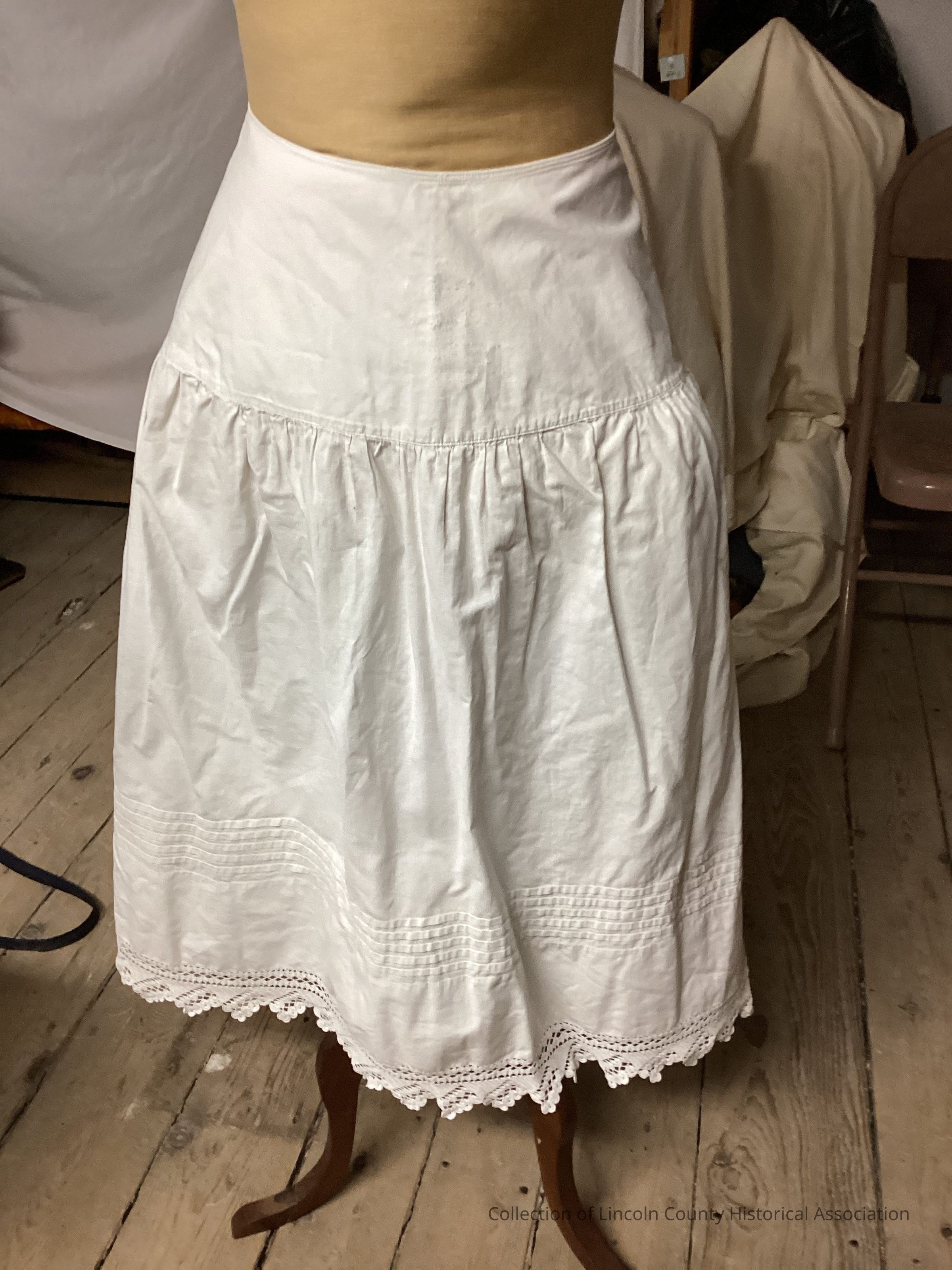 Simple white cotton women's petticoat. Pleats near bottom of skirt. Embroidery at bottom of skirt, ending in points/triangles at hemline.Clothing/Dress/Costume Details