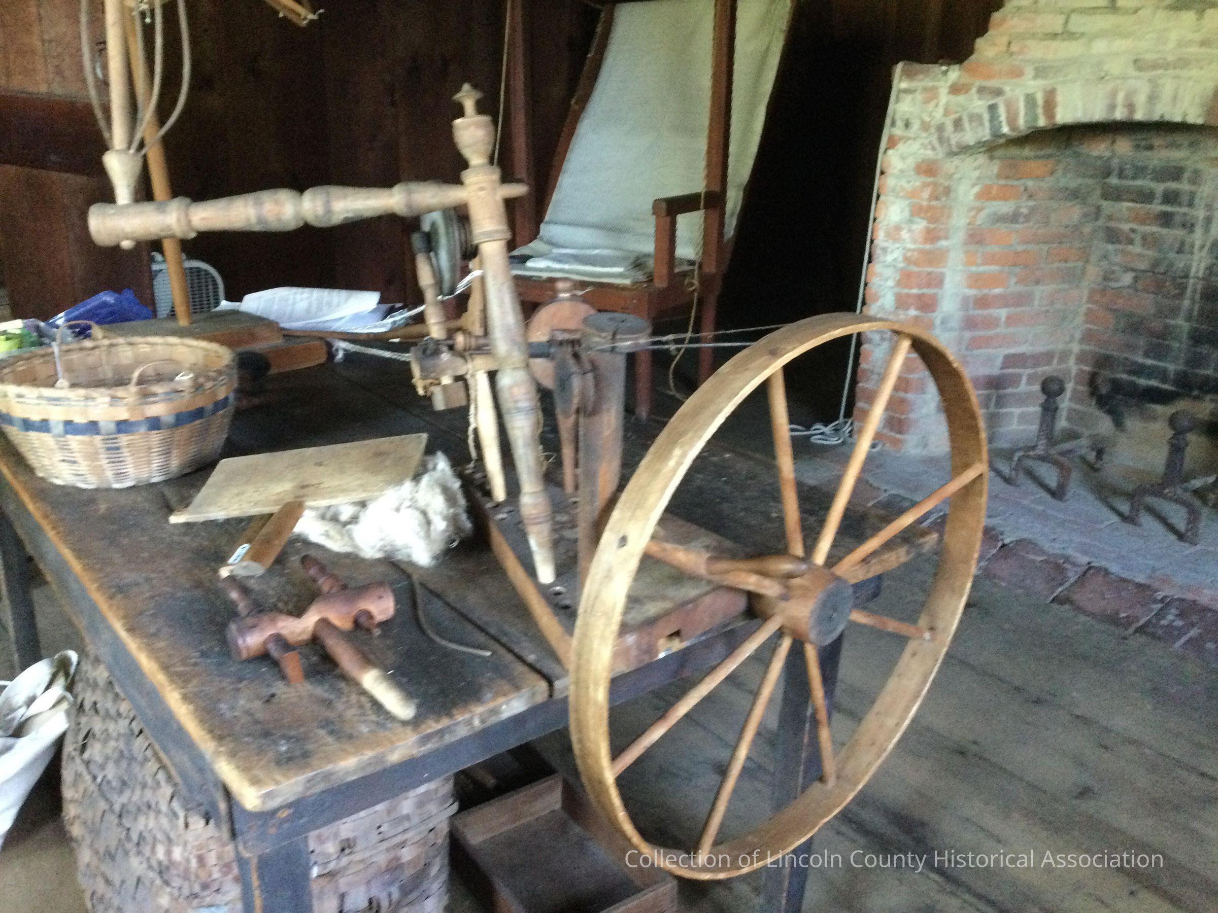 Hathorn's spinning wheel. Wood and metal, comprised of several interchangeable parts. Designed to be attached to a table top.Made/Created