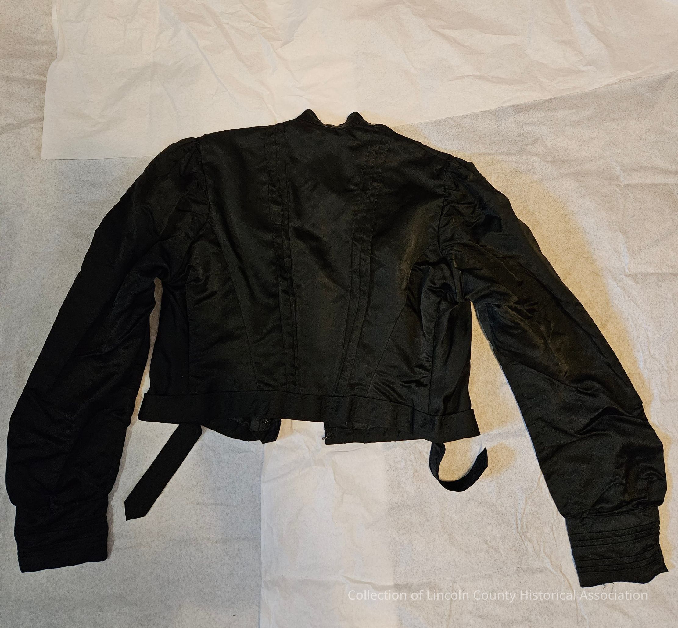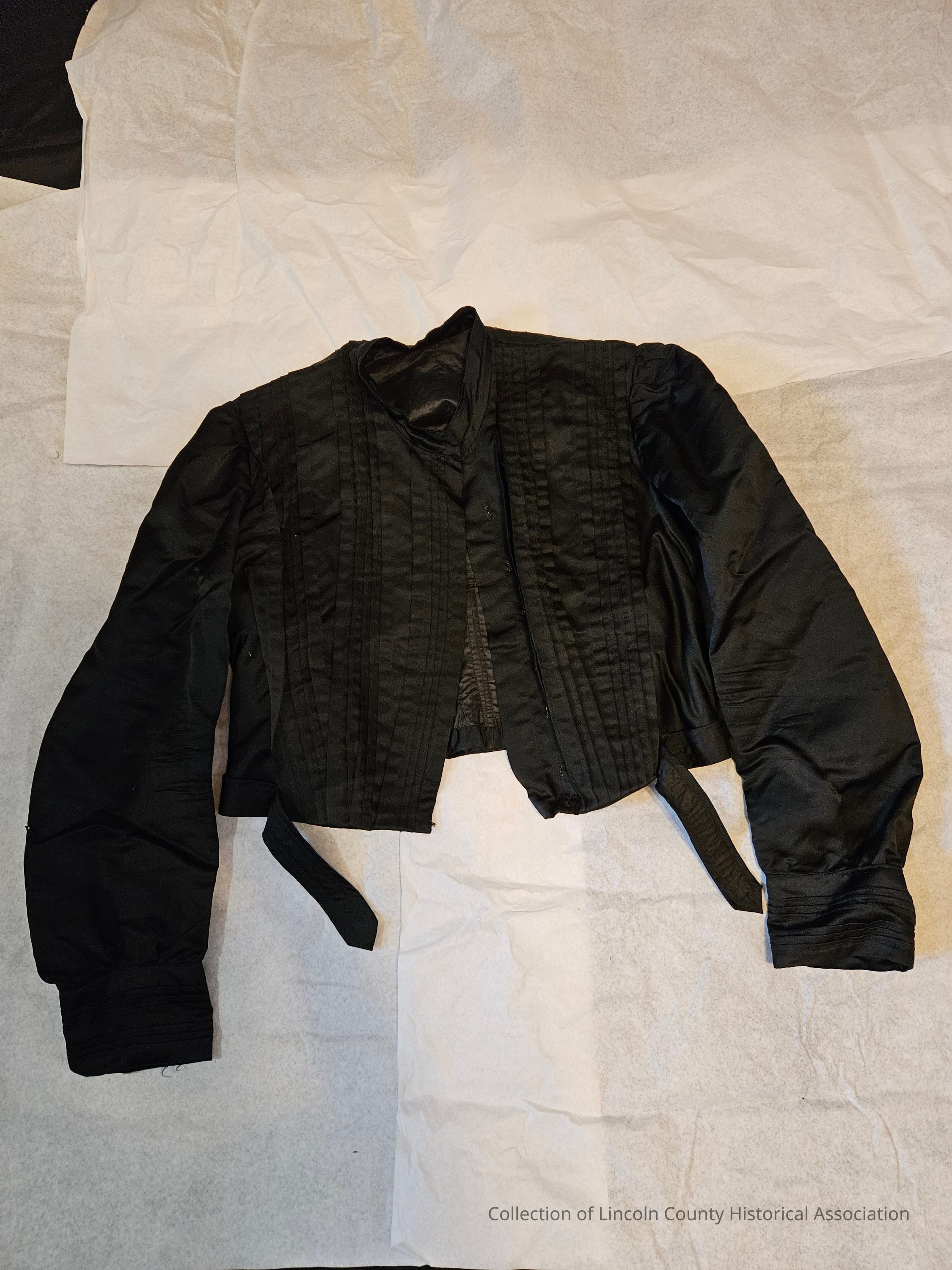 Black silk bodice. Pleated down the front, in the back, and around cuffs. Belt at waist. Boned. Metal clasp closures. Machine stitched.Clothing/Dress/Costume Details