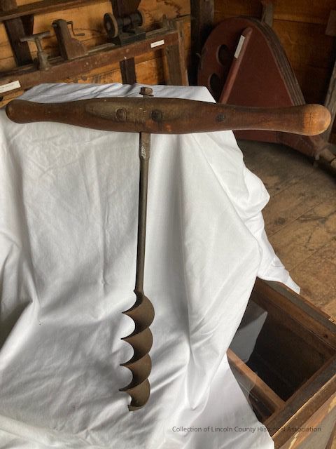 Iron auger with a wooden handle. Double blade bit with screw tip. Has five spirals. Wooden handle is hickory and is reinforced with metal rivets. Has four cutting blades above the screw point. Tool most likely used for preparation of wooden house beams.