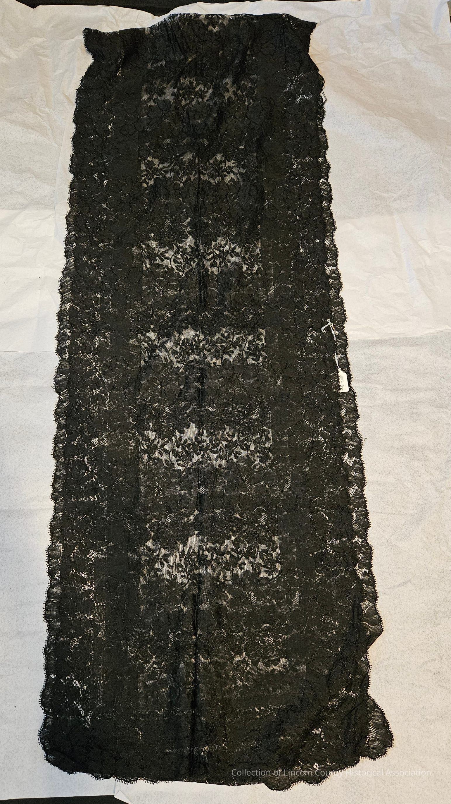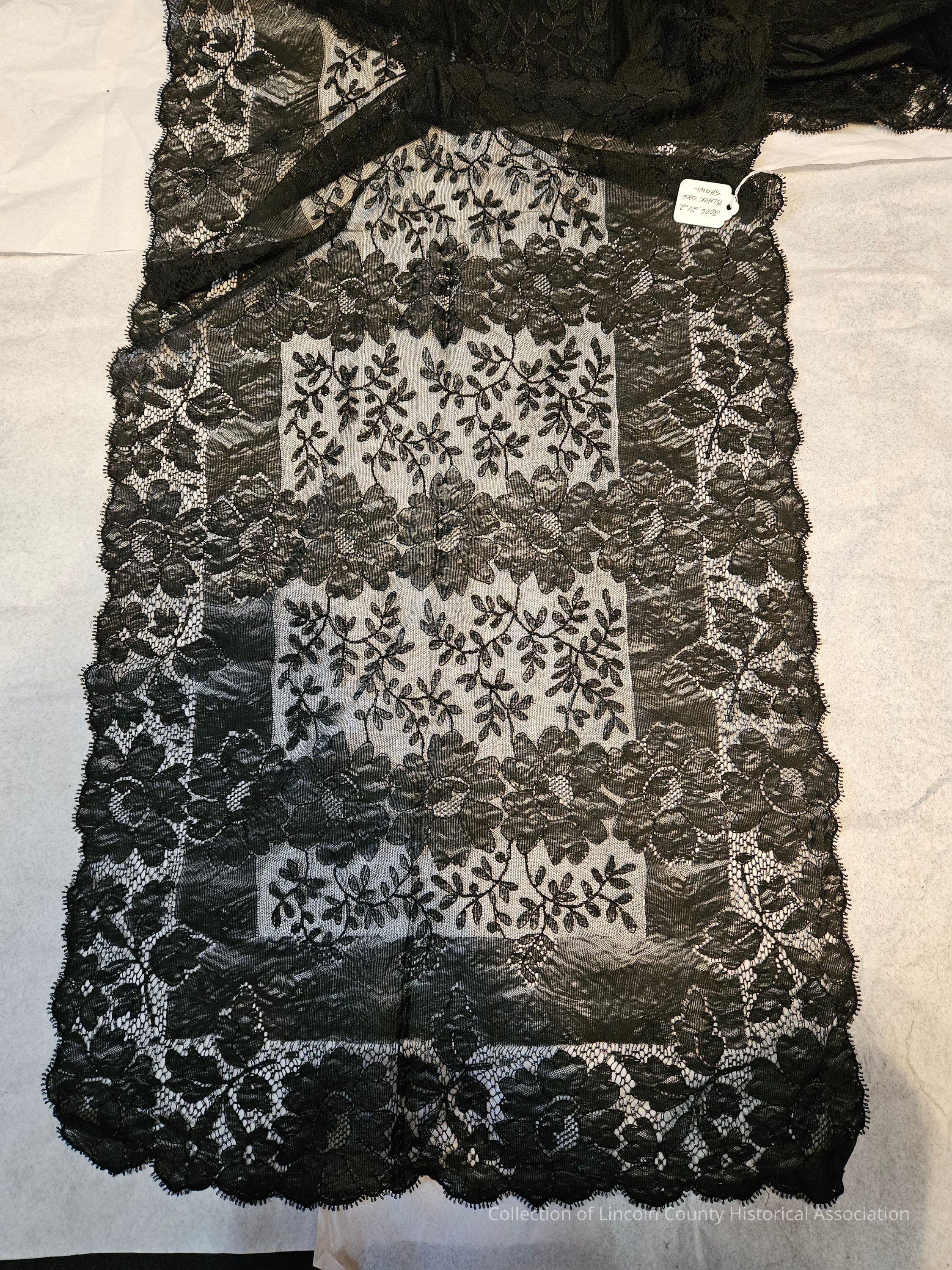 Long black lace rectangular shawl. Flower and leaf design. Darker black strip closer to the edge around border of scarf. Scalloped edges. Machine made.Clothing/Dress/Costume Details