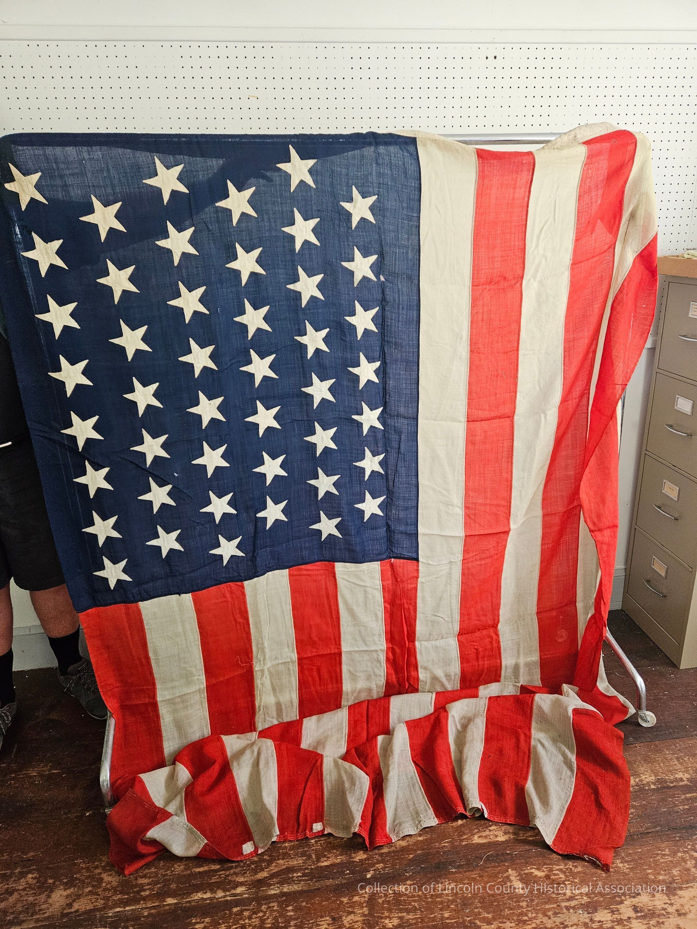 45 star flag. Commercially made. Made of light, gauzy wool bunting.Made/Created
