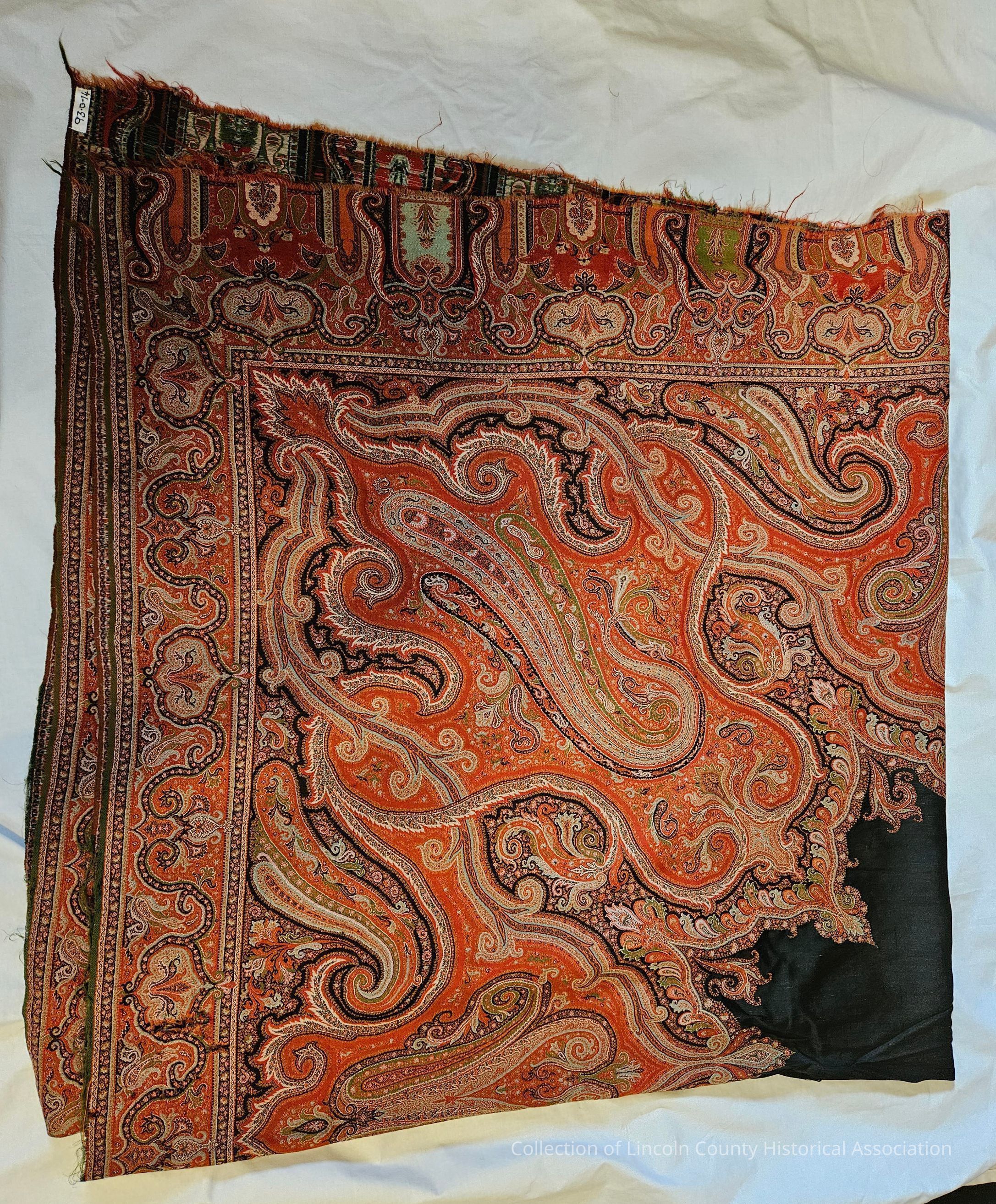 Woven wool shawl with an overall polychrome design. Center medallion is plain black. One border around two of the edges, two borders around the other two. Arch designs in red, green, blue, and orange. Square in shape.Clothing/Dress/Costume Details