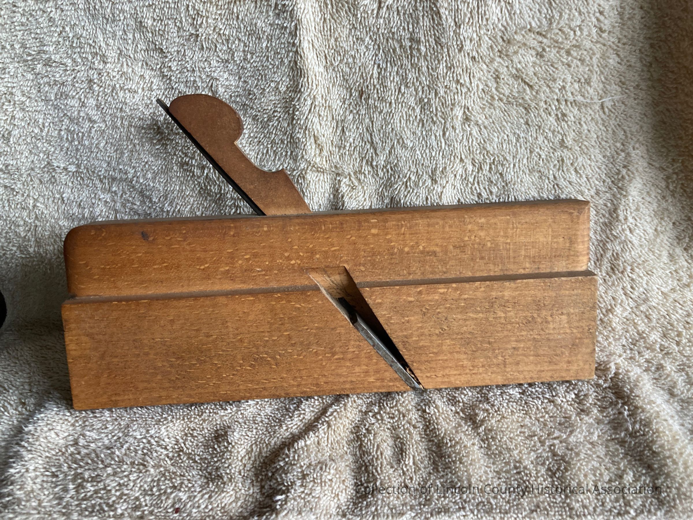 Beech wood hollow concave moulding plane. Its iron blade ends with a steel cutting edge. Rectangular block with a rounded bottom and a tapering side.Made/Created