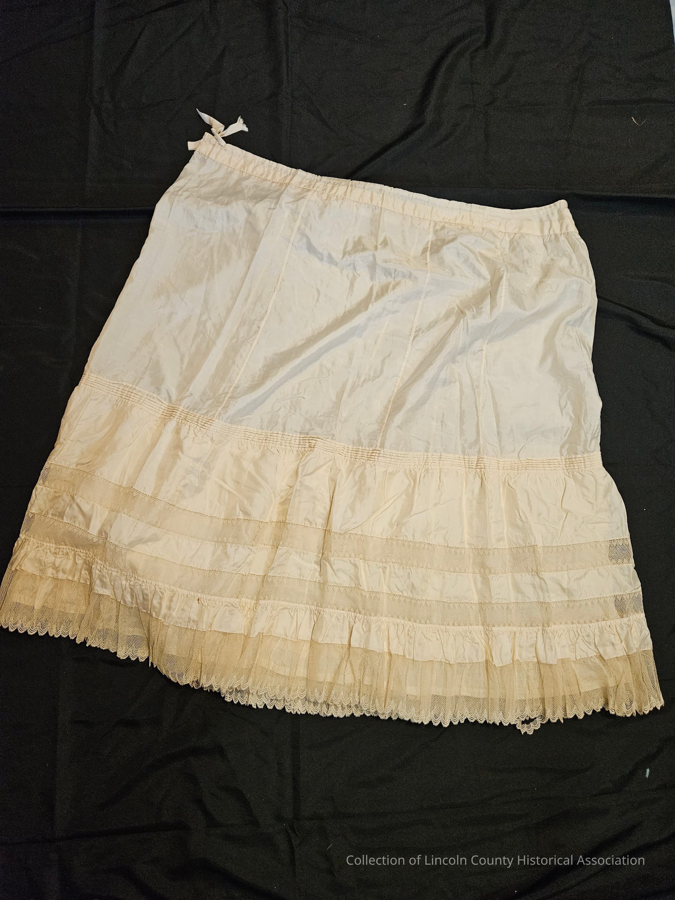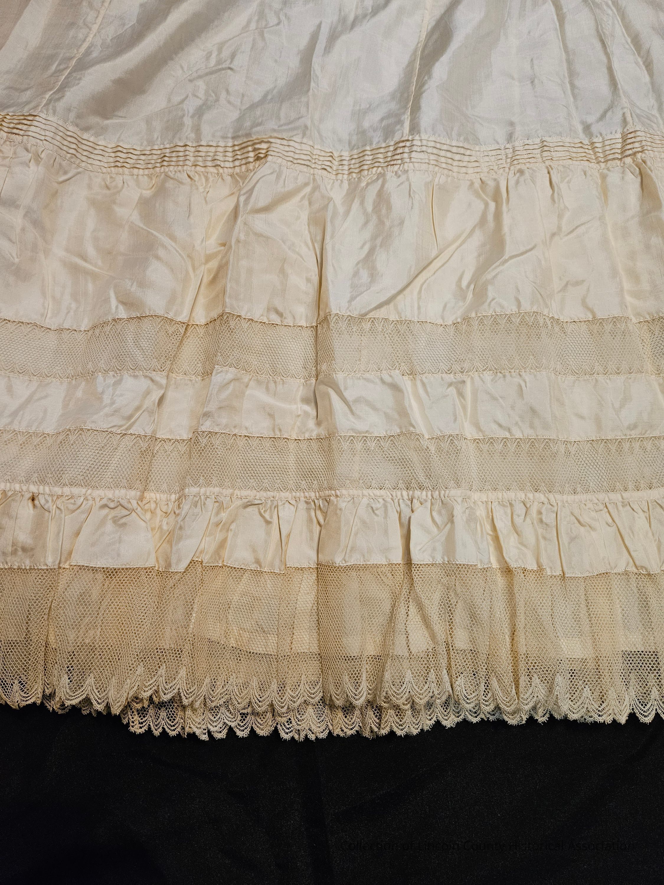 Women's cream colored silk petticoat. Adjustable drawstring at waist. Two inset bands of lace and lace edging at the bottom. Machine stitched. Pleats around middle of skirt.Clothing/Dress/Costume Details