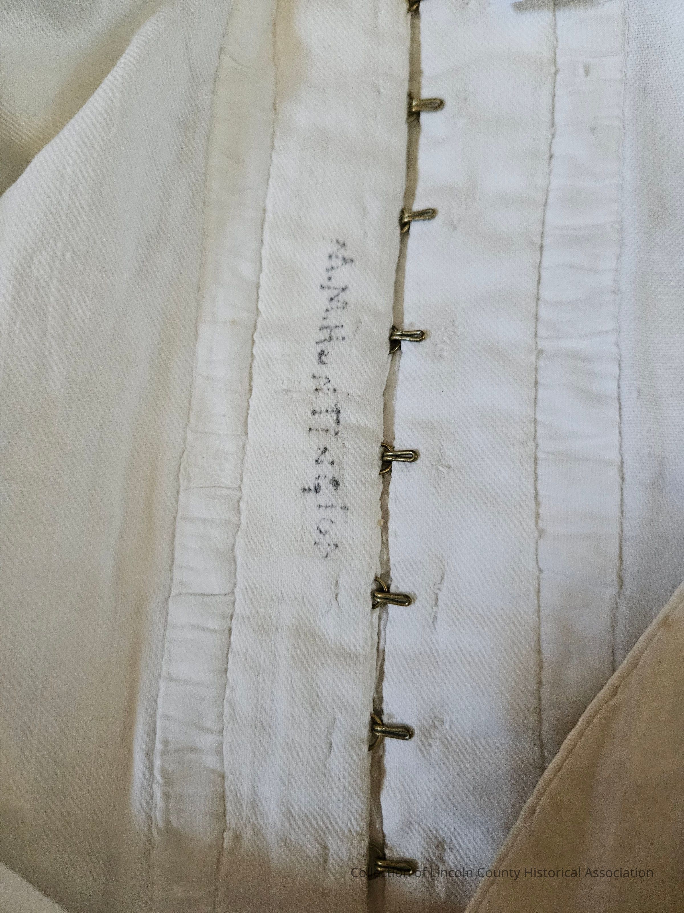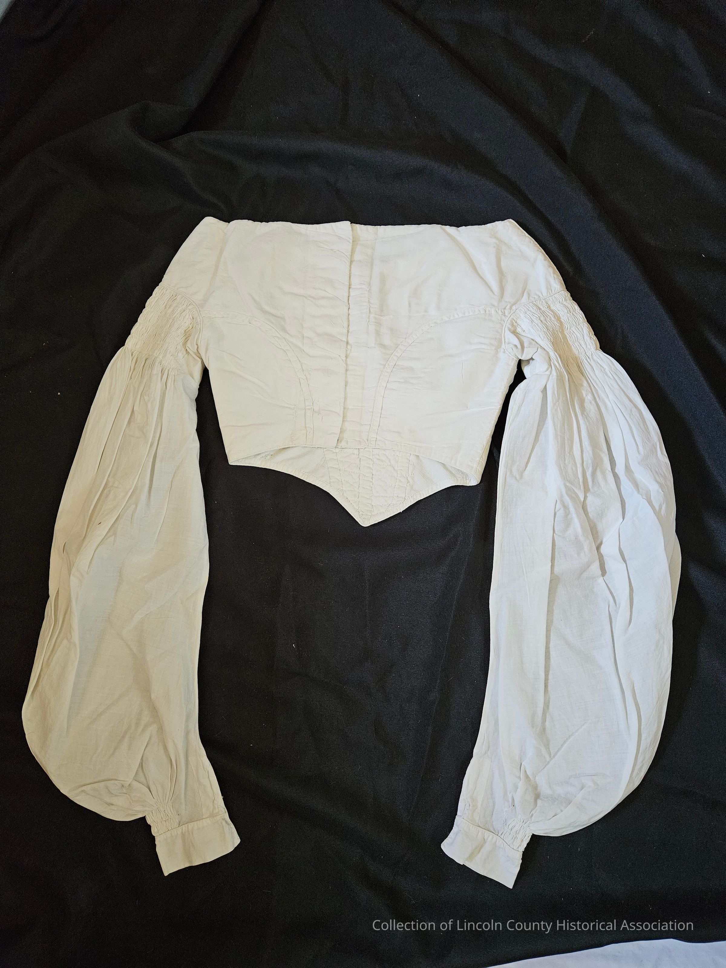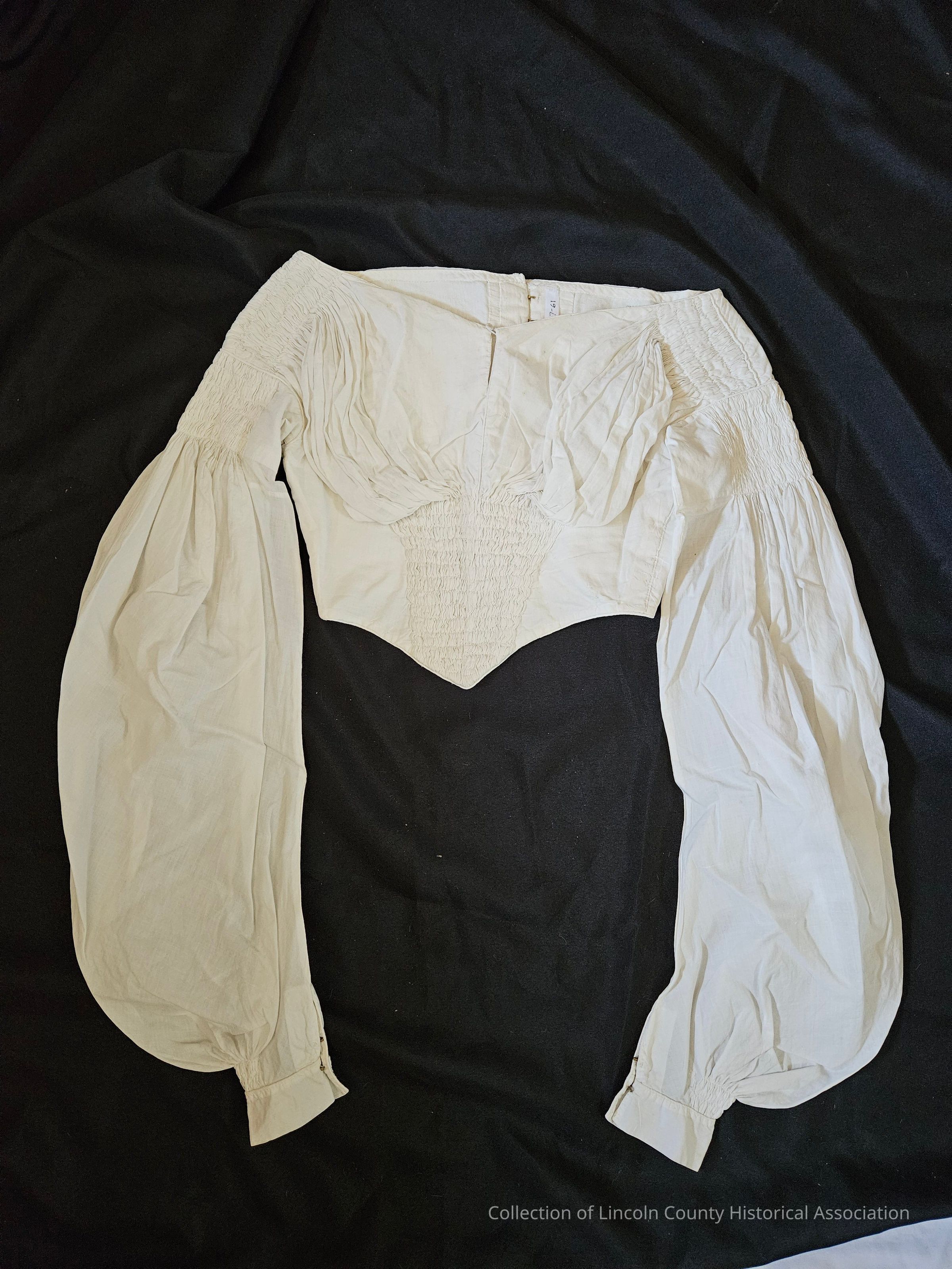 White cotton muslin blouse. Smocking on bodice and top of long, full sleeves. Gathered at chest. Hook and eye fasteners. Hand stitched.Clothing/Dress/Costume Details