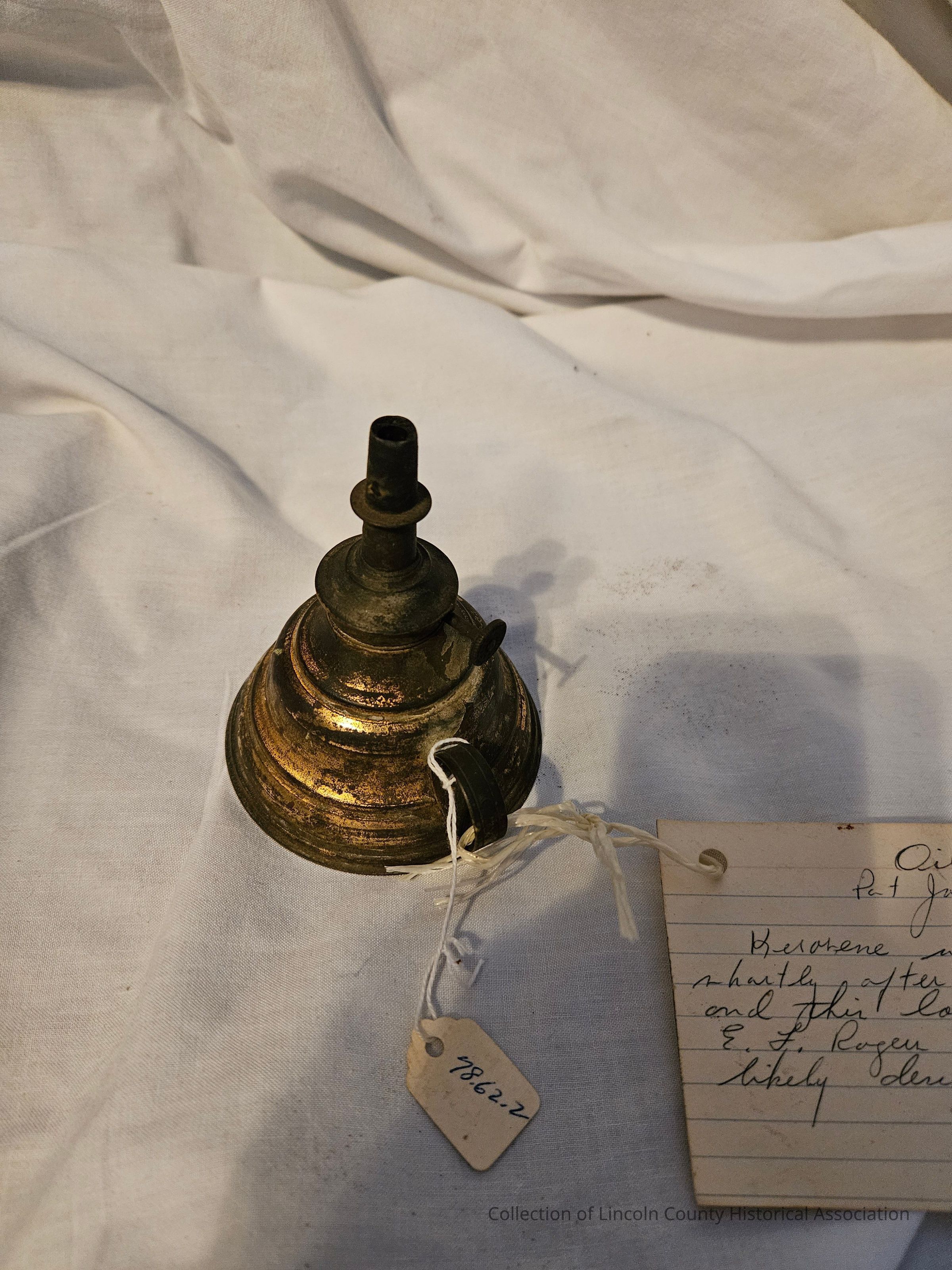 Small metal kerosene oil lamp. Small handle. Bell shaped.