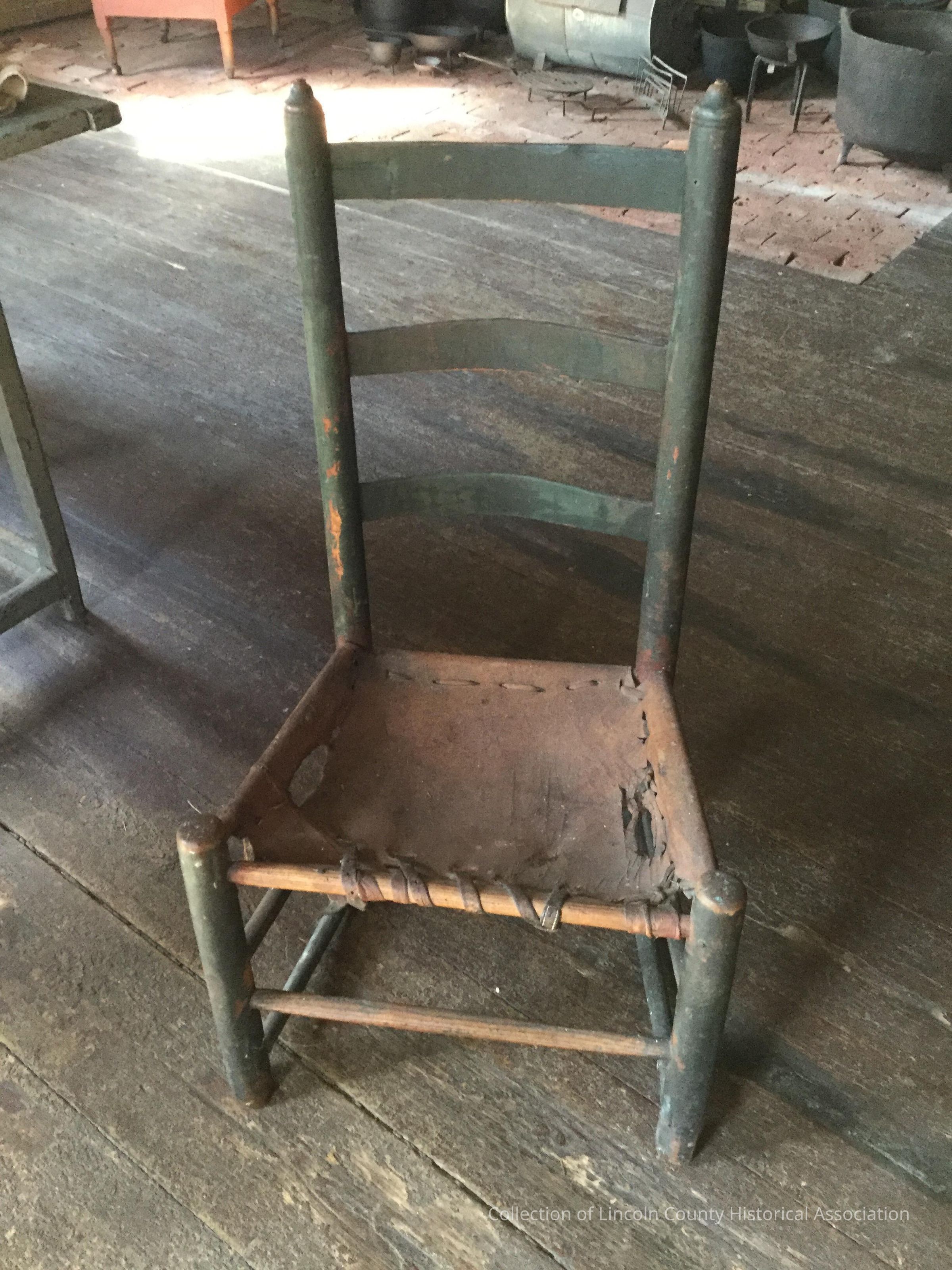 Country, primitive, ladder back chair with original blue/green paint. Leather seat sewed on to chair with a leather thong.Made/Created