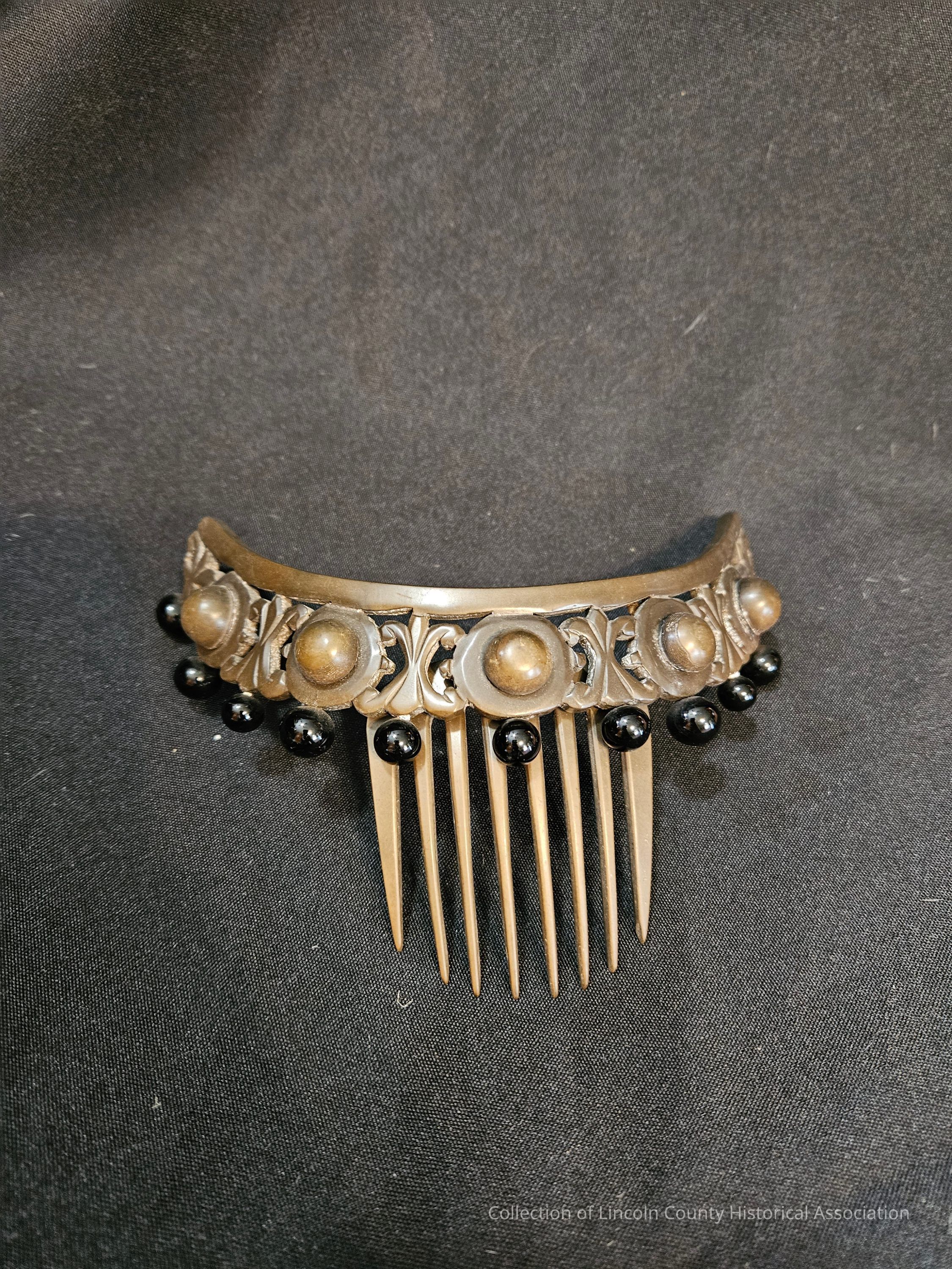 Ornamental plastic tiara shaped hinged comb. Black and brown beads. 8 teeth.