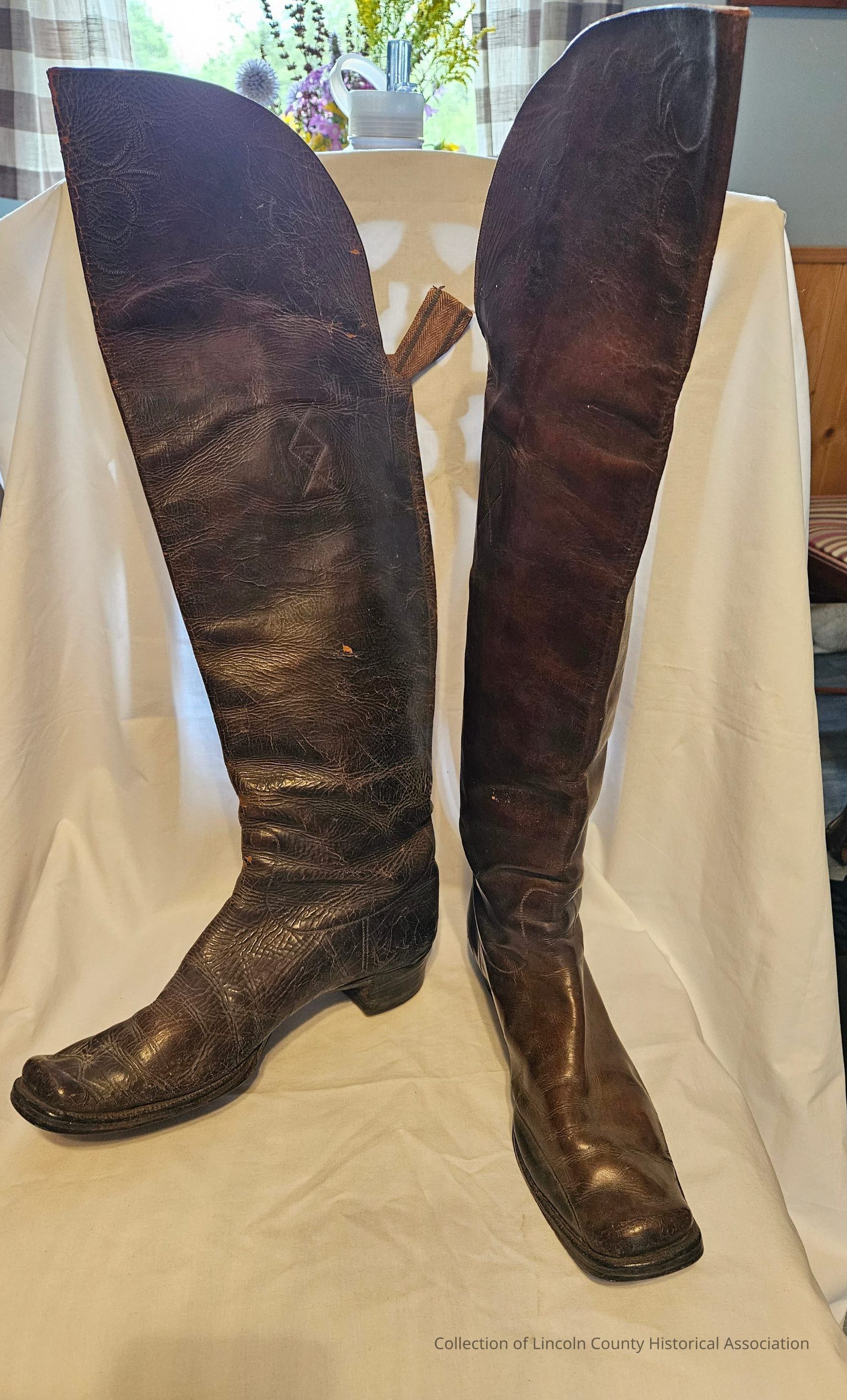Pair of brown leather men's boots. Square toes. Mend near toe of left boot. Light stitched design. Two interior straps on each boot for putting on.