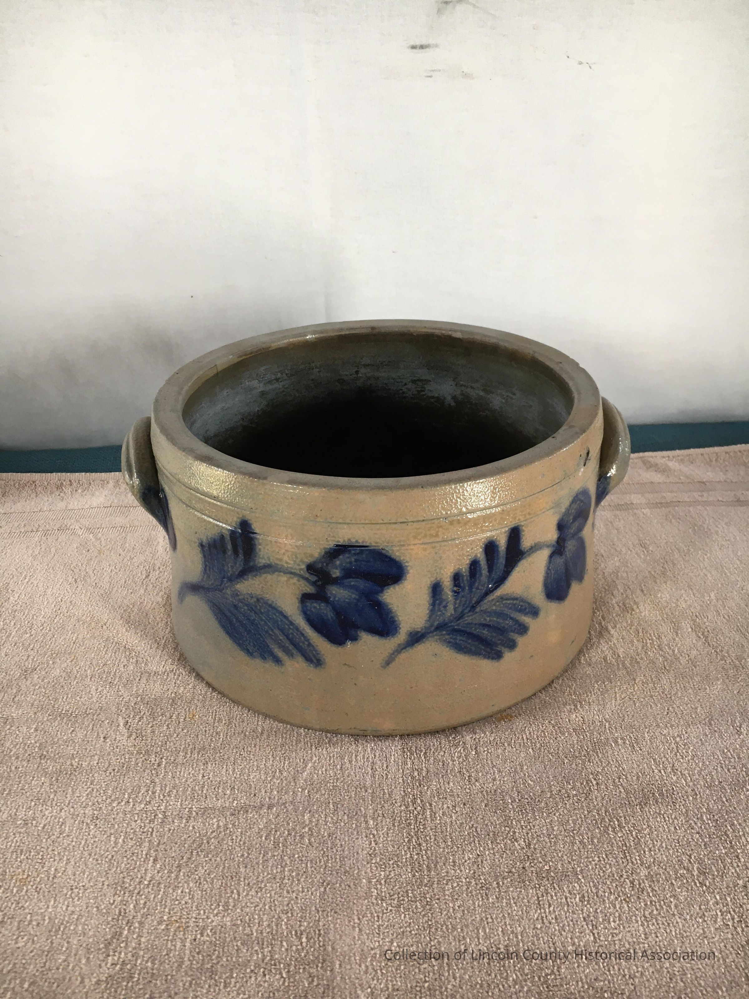 Round ceramic container with salt glaze with blue glaze floral pattern consisting of flowers (tulip-like) on fern-like stems, two on each exterior side. Blue circular dabs at the base of the two side handlesMade/Created