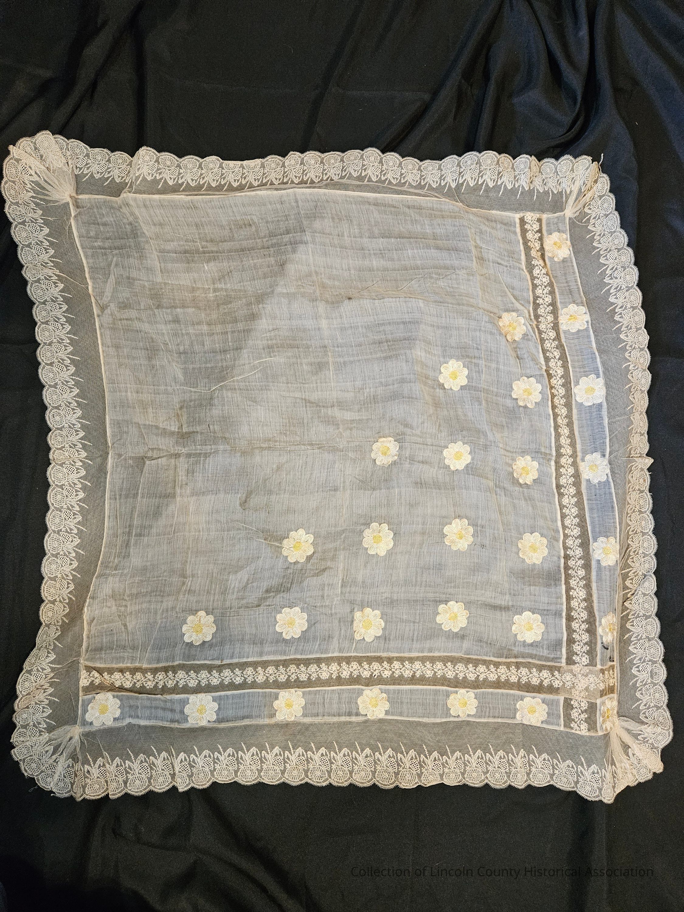 White lace-edged chiffon shawl. White daisy designs in one corner. Floral designs along the lace edges. Edges are scalloped.Clothing/Dress/Costume Details
